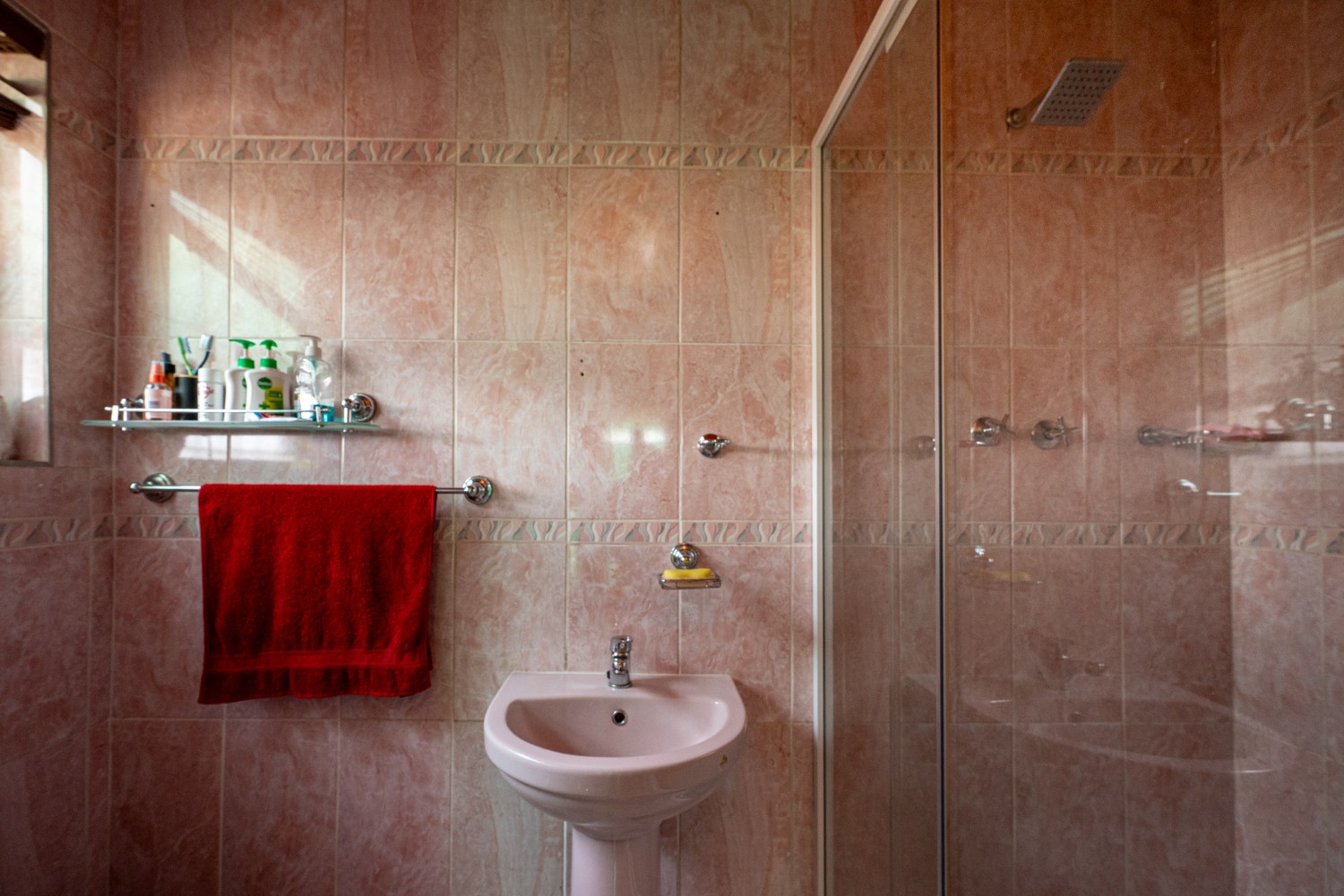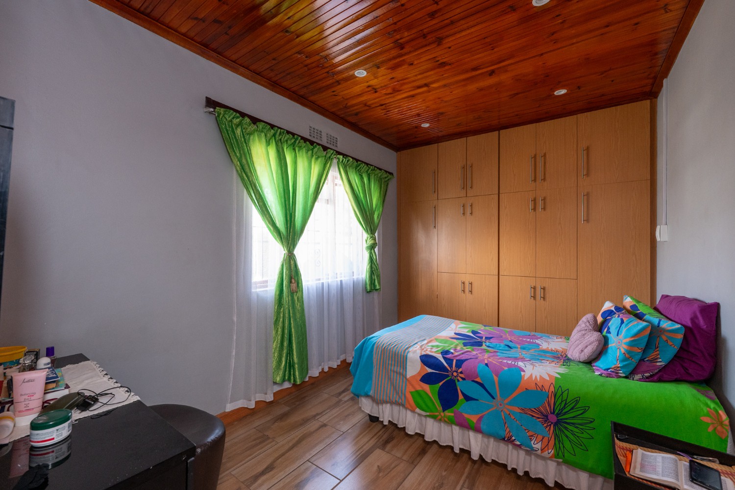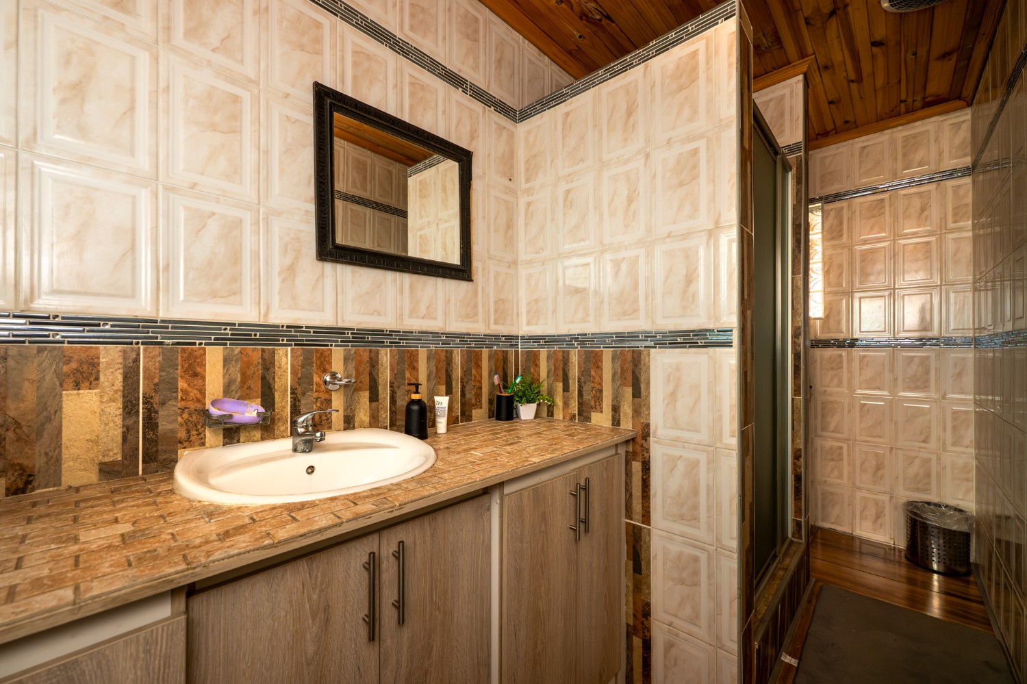 This home boasts three comfortable bedrooms, two of which include built-in cupboards. The main bedroom is a private retreat, complete with its own en-suite bathroom with a shower, basin and toilet. A family bathroom serves the rest of the home, fitted with a bath, shower, basin, and toilet for convenience.