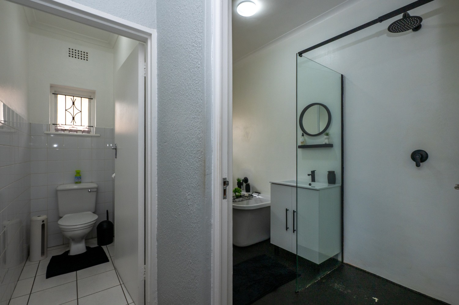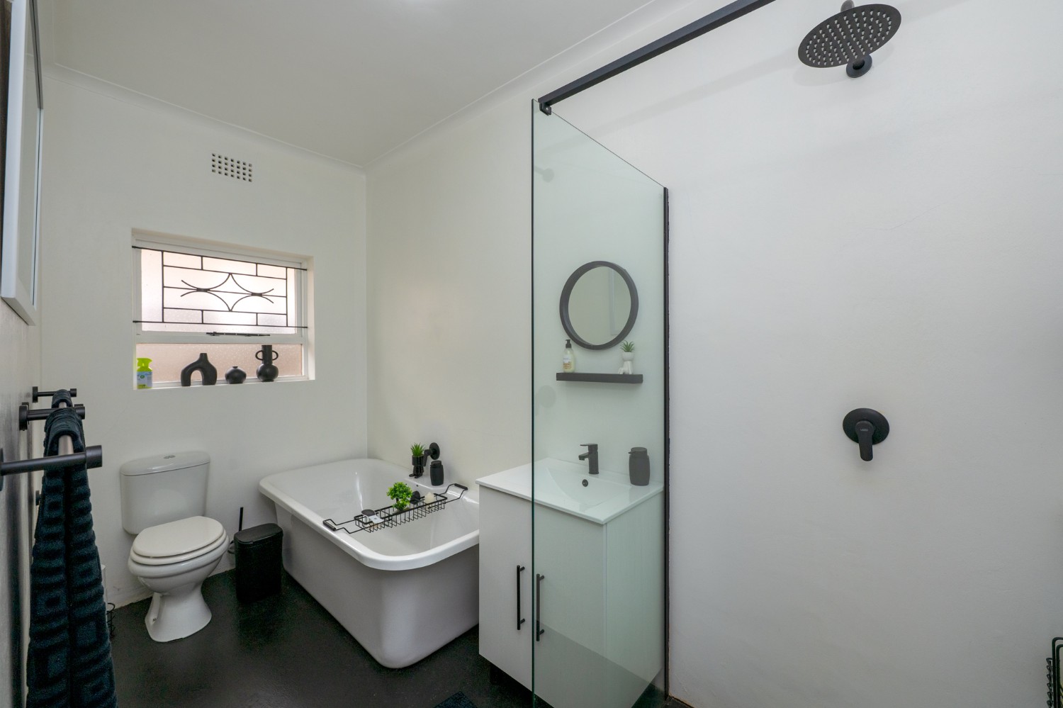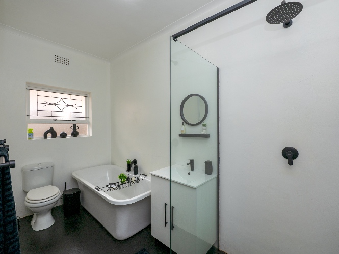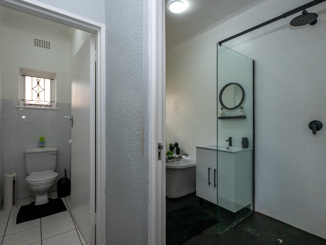 All three bedrooms are generously sized with built-in cupboards, providing plenty of storage space for the whole family. The modern family bathroom is elegantly finished, featuring a walk-in shower, a lovely bathtub, basin, and toilet, while a separate guest toilet adds extra convenience.