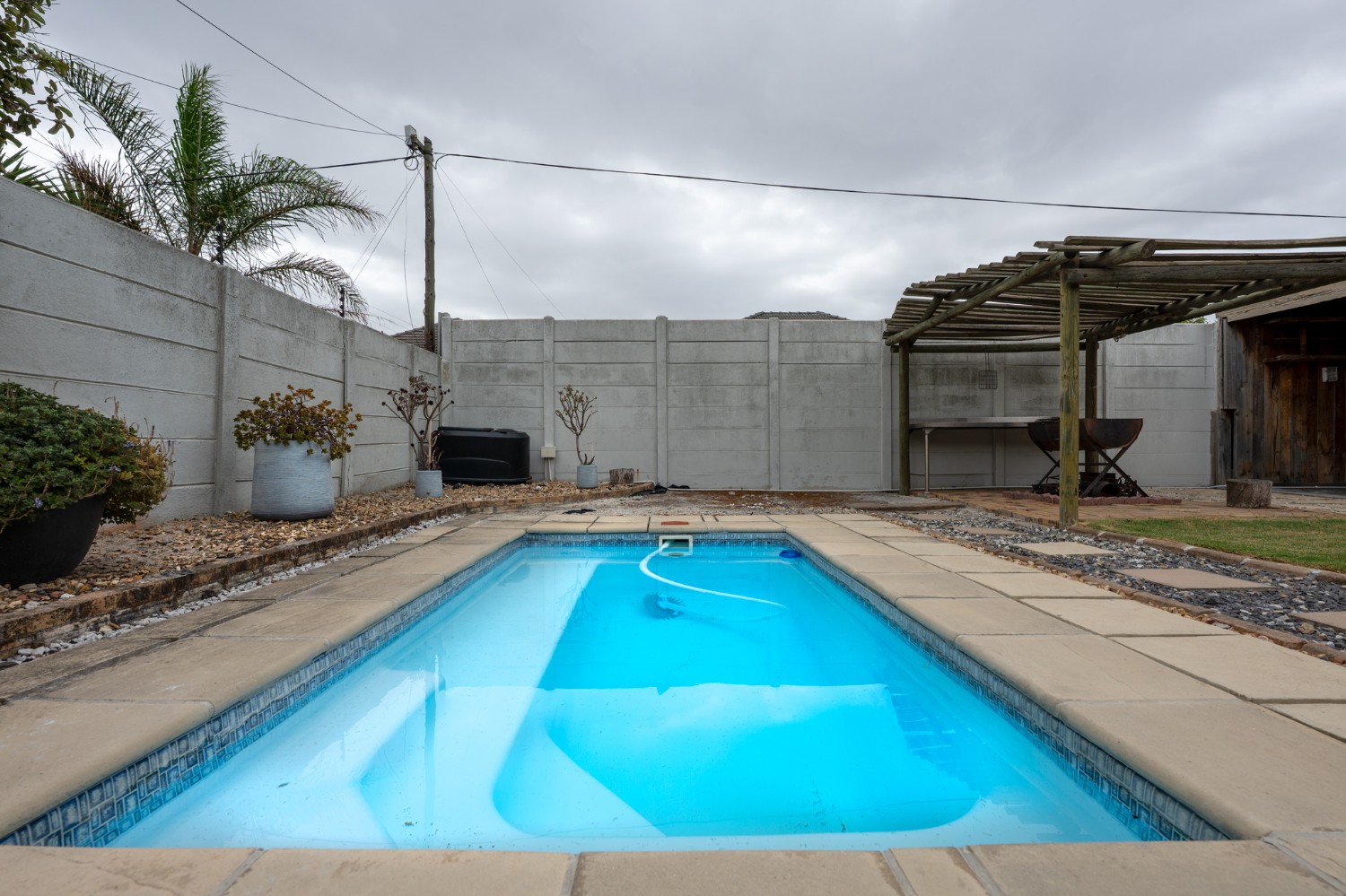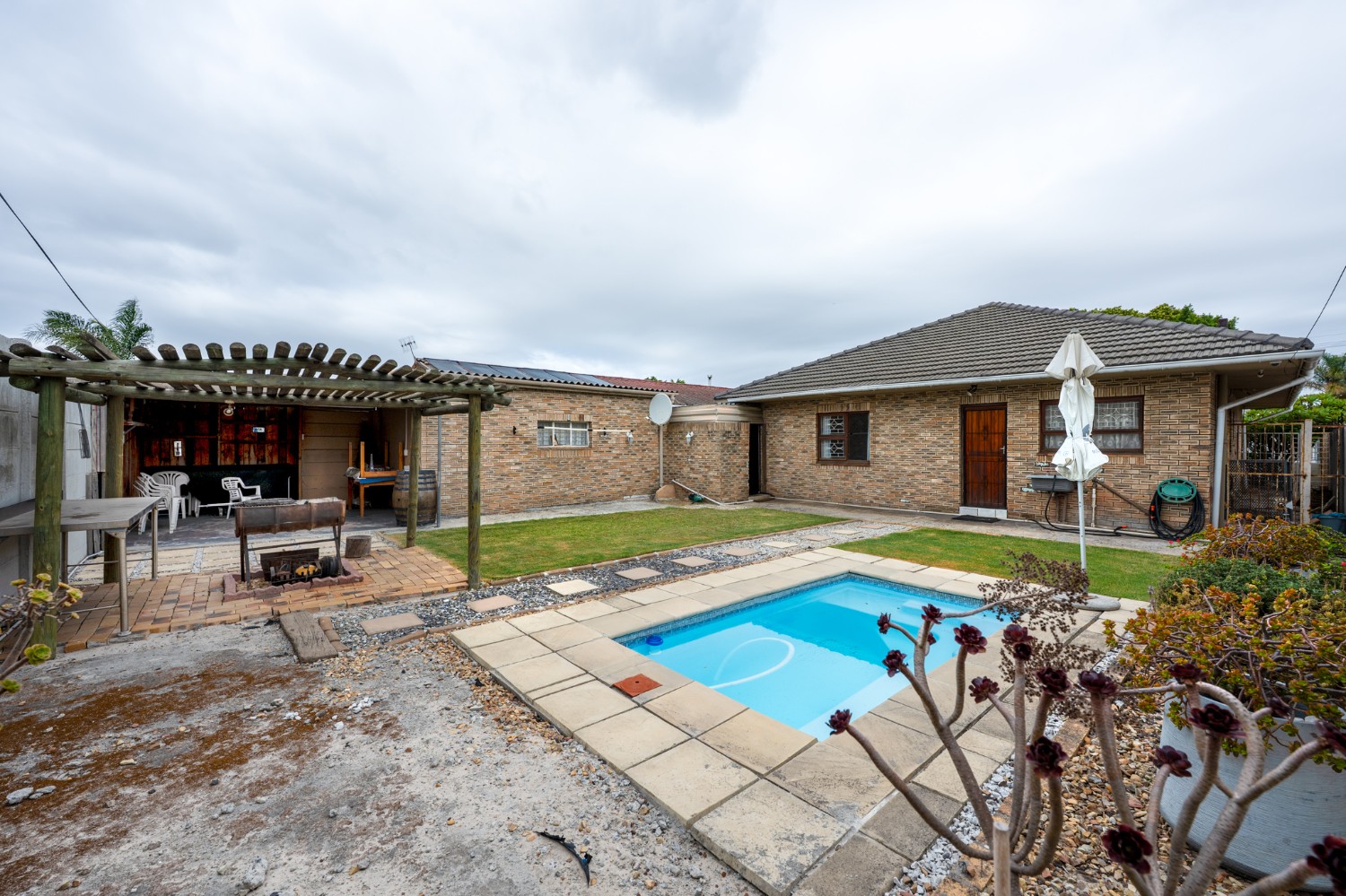 The outdoor space is truly a highlight of this home. The back garden boasts a sparkling swimming pool, a covered braai area, and an additional covered entertainment space perfect for hosting family and friends or simply enjoying warm summer days in comfort. Additional features include a tandem garage, enclosed parking for added security, and a dedicated study room.
