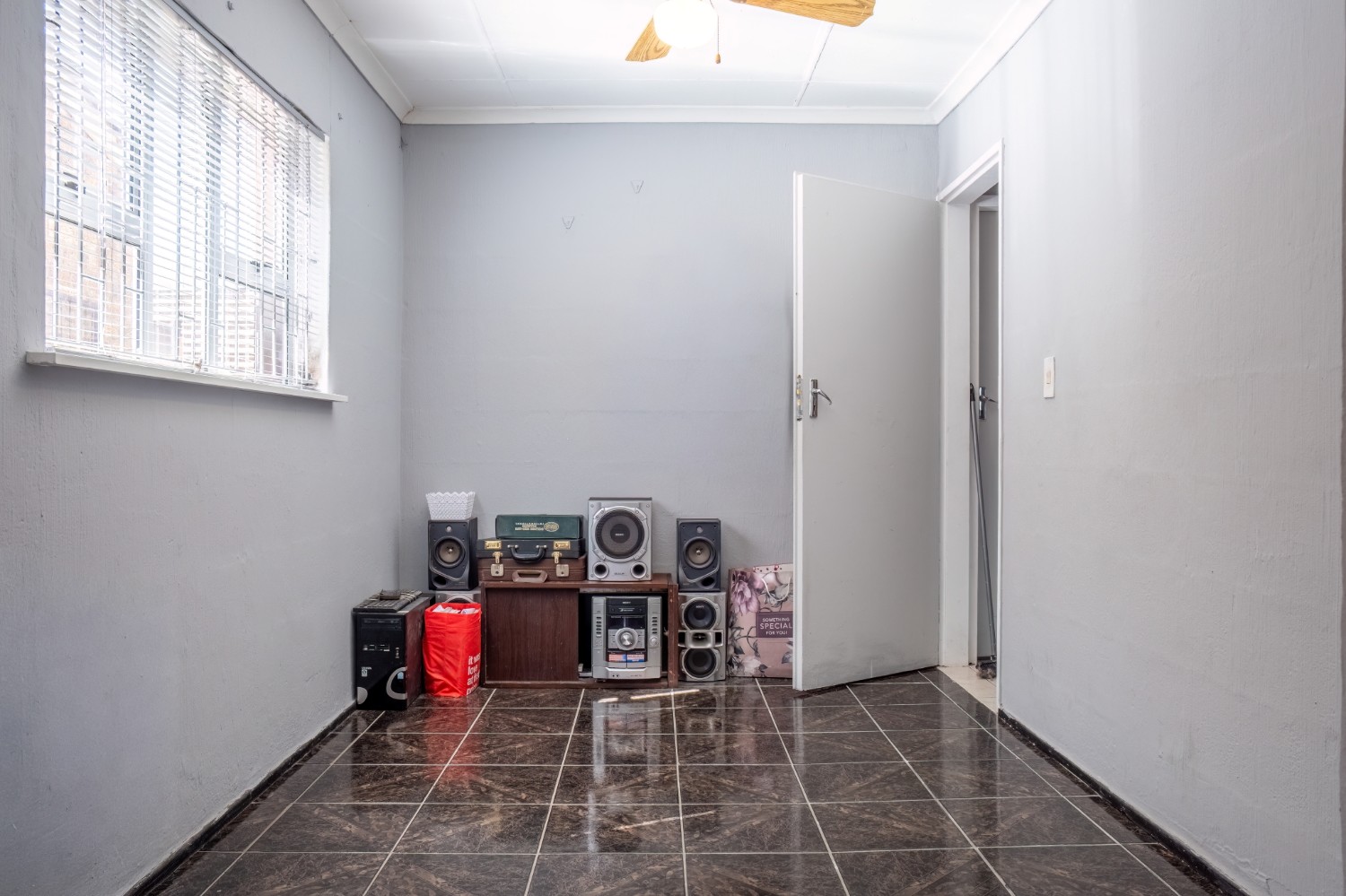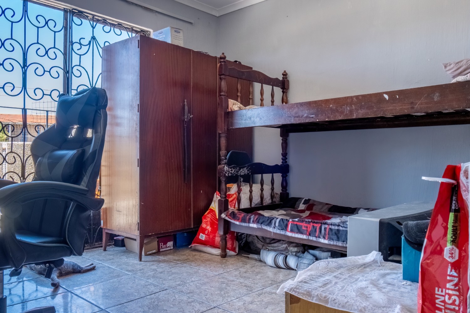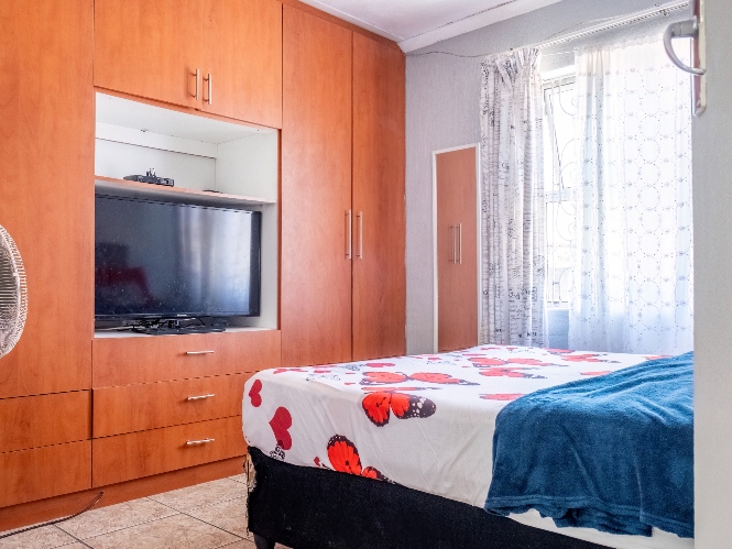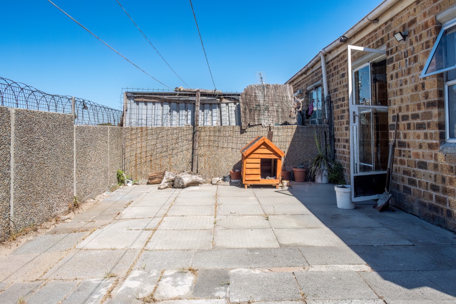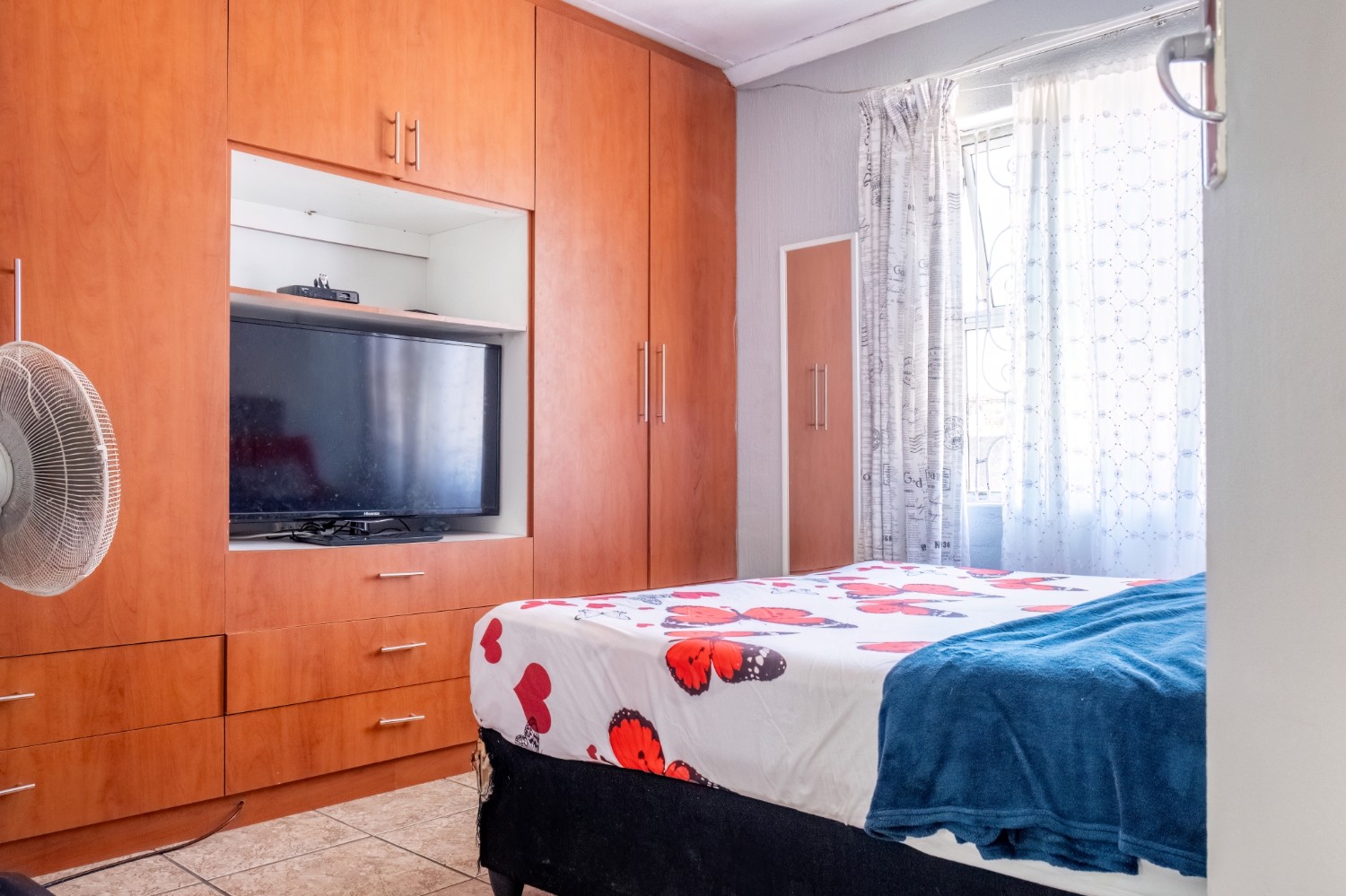 The home features three spacious bedrooms, with the main bedroom fitted with built-in cupboards. A family bathroom services the home.