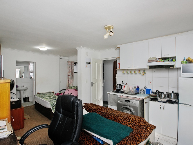 The apartment features an open-plan layout with a bathroom fitted with a shower, toilet, and hand basin. The kitchen area is designed for practicality, with space for a washing machine, fridge, and stove.