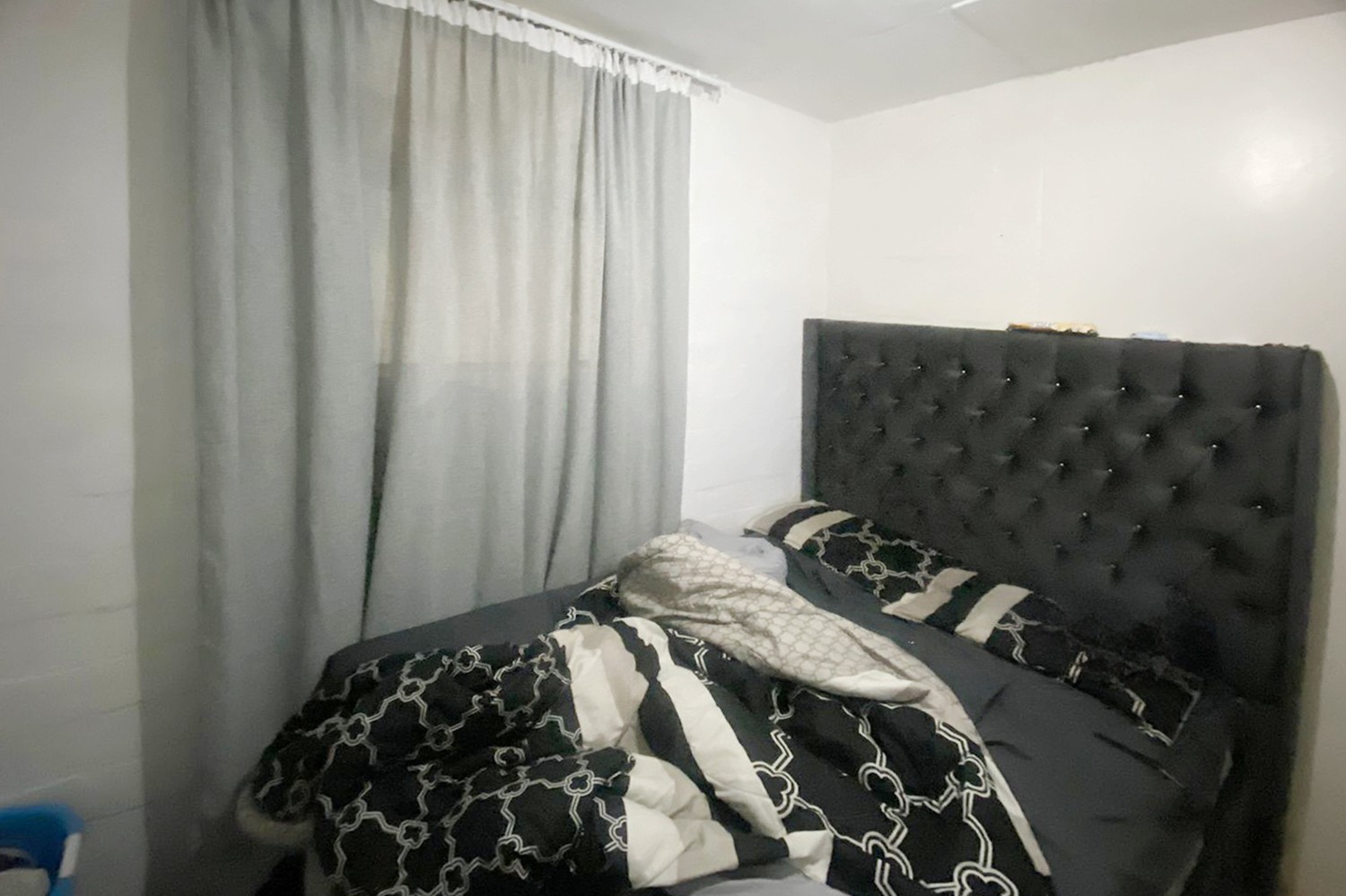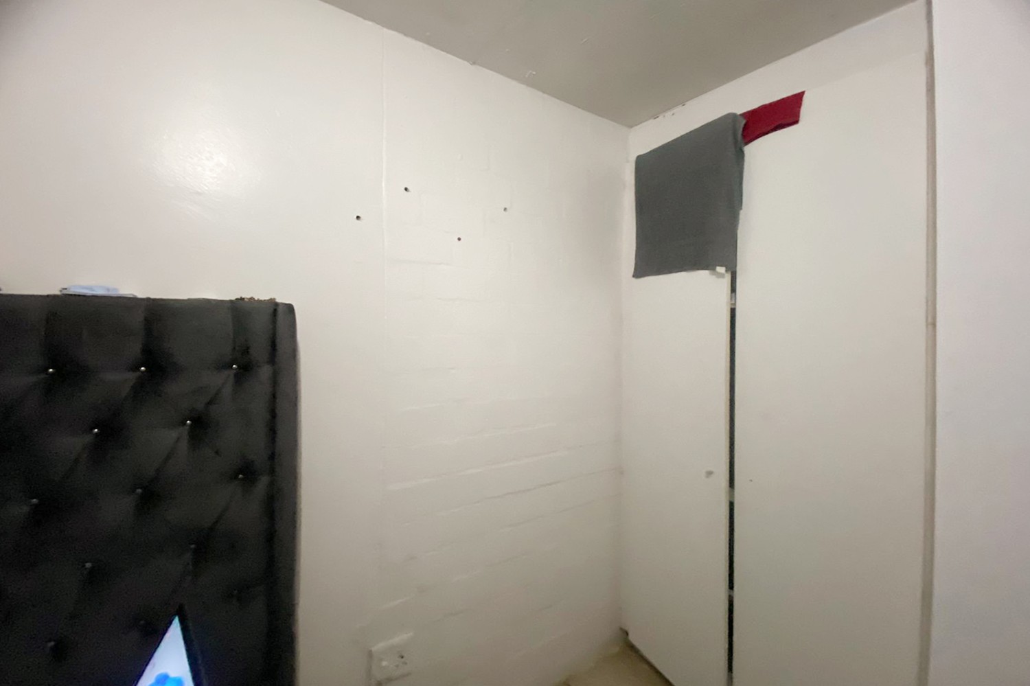 A bedroom with built-in cupboards