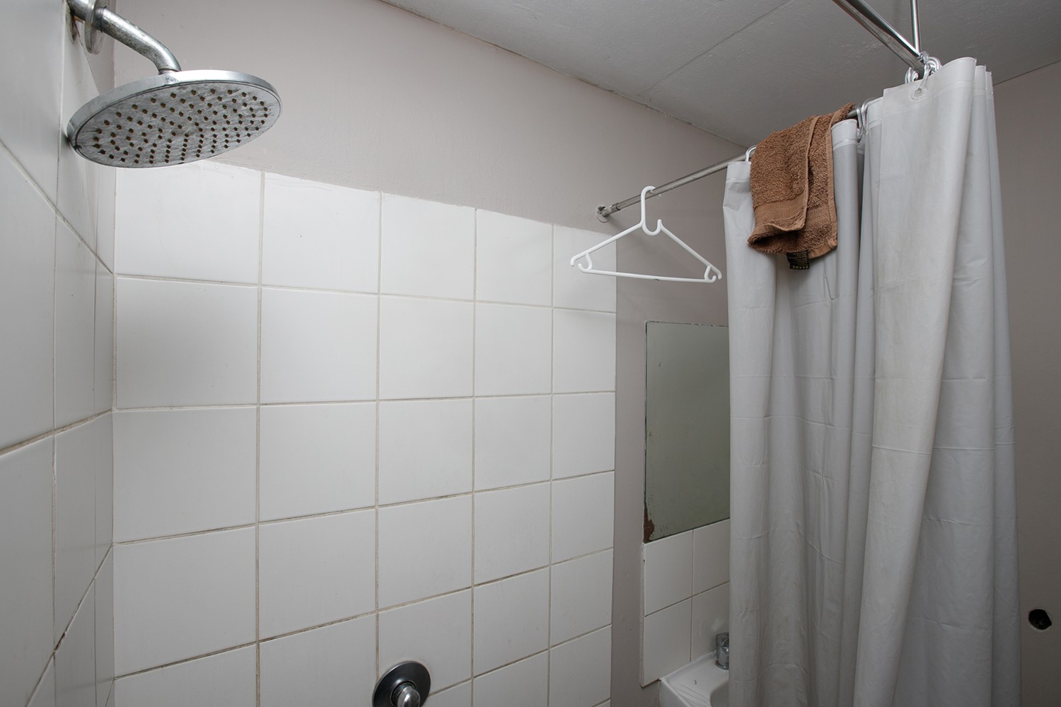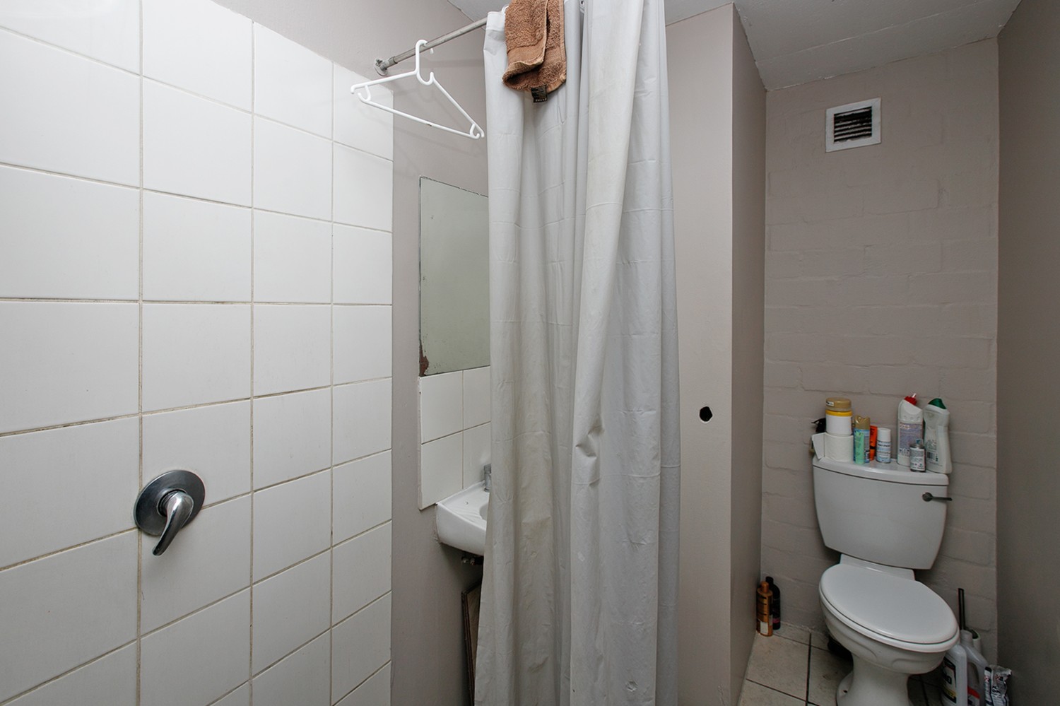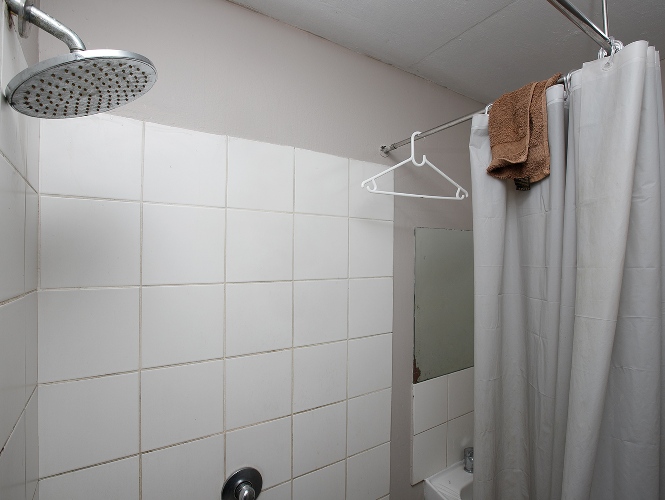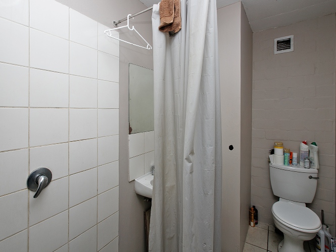 Lounge with a basic kitchen and a bathroom with a toilet, shower and basin.