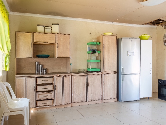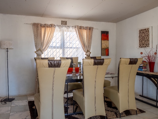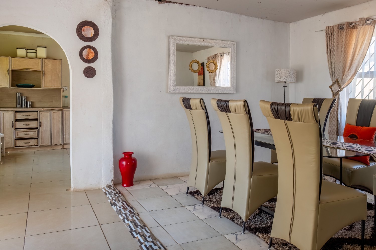 Upon entering the home, you are welcomed into a generously sized lounge with tiled flooring, creating a comfortable and inviting living space. This area flows seamlessly into a large dining room, ideal for hosting family meals and gatherings. The kitchen is well-appointed with freestanding cupboards and offers excellent potential for customisation, allowing you to design and create your dream kitchen.