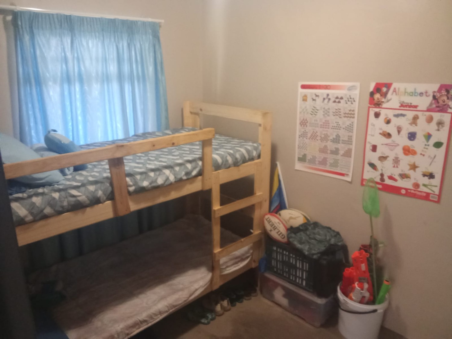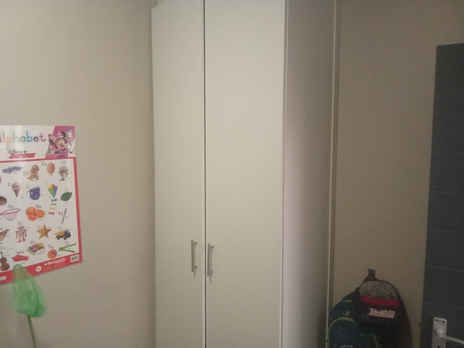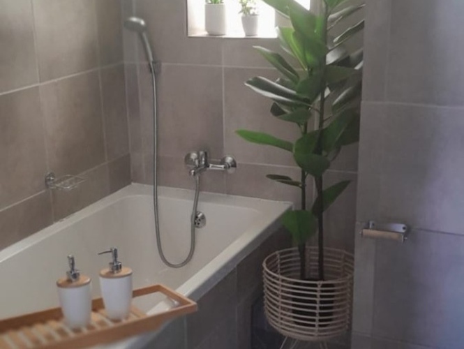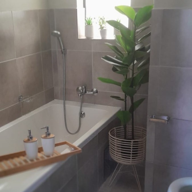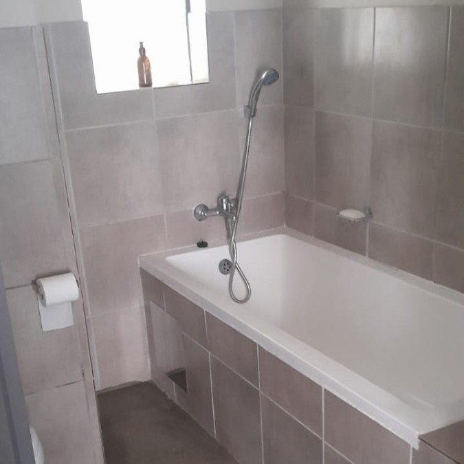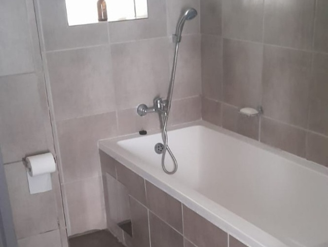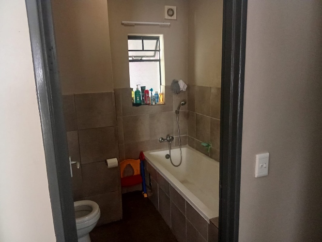 Both bedrooms are well-sized, fitted with built-in cupboards, offering ample space and natural light, making them ideal for restful living. The bathroom is neatly appointed and includes a bathtub, basin, and toilet.