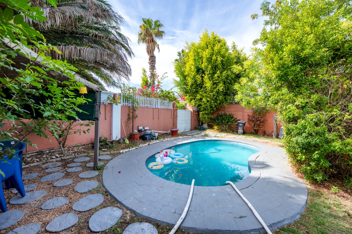 Step outside to a charming backyard oasis, featuring a sparkling pool and plenty of greenery perfect for relaxing or enjoying outdoor activities with loved ones. Additional features include a double automated garage, a front garden, and additional parking for two vehicles.