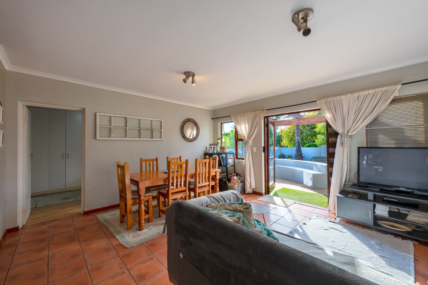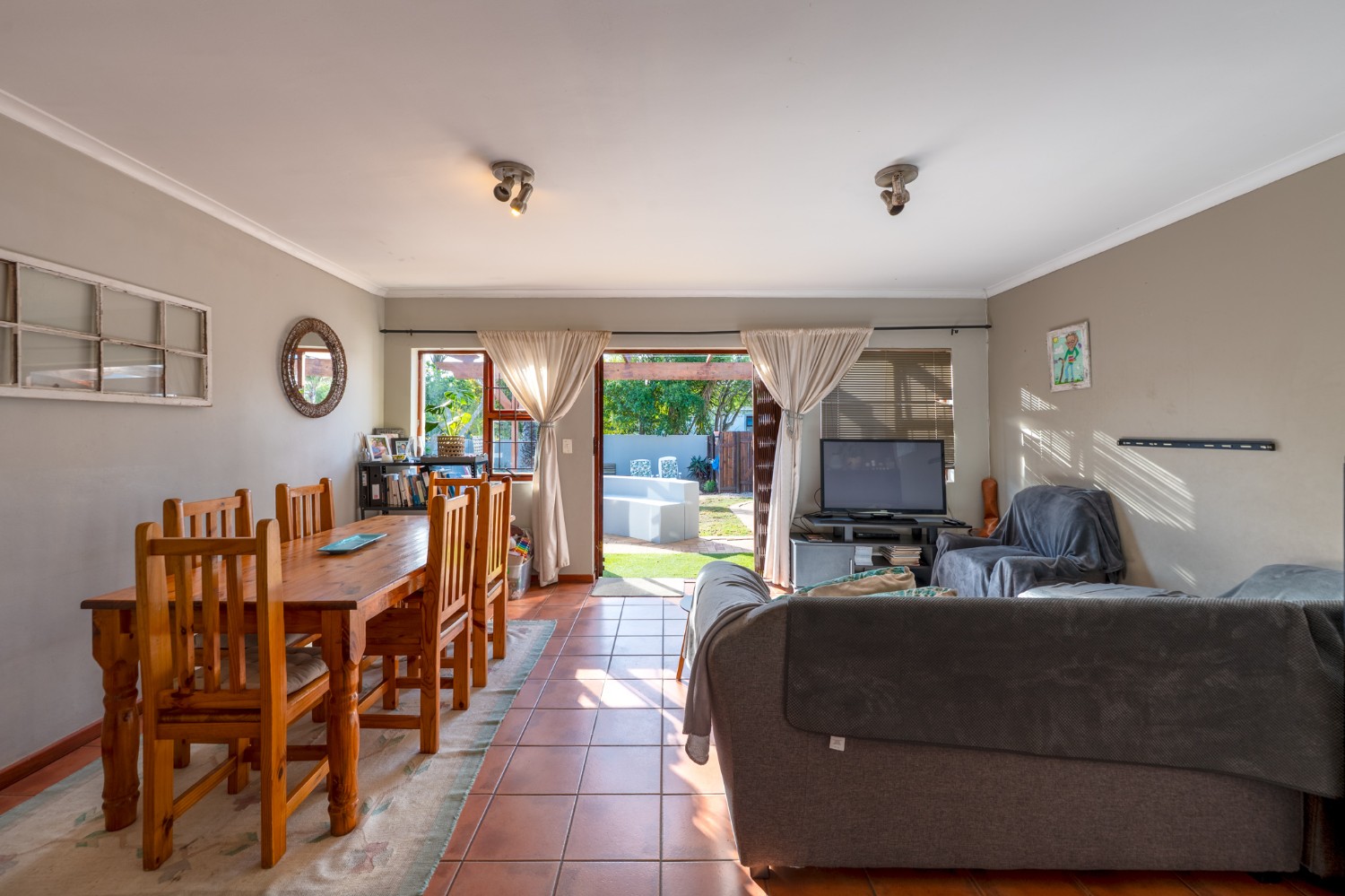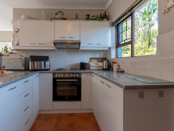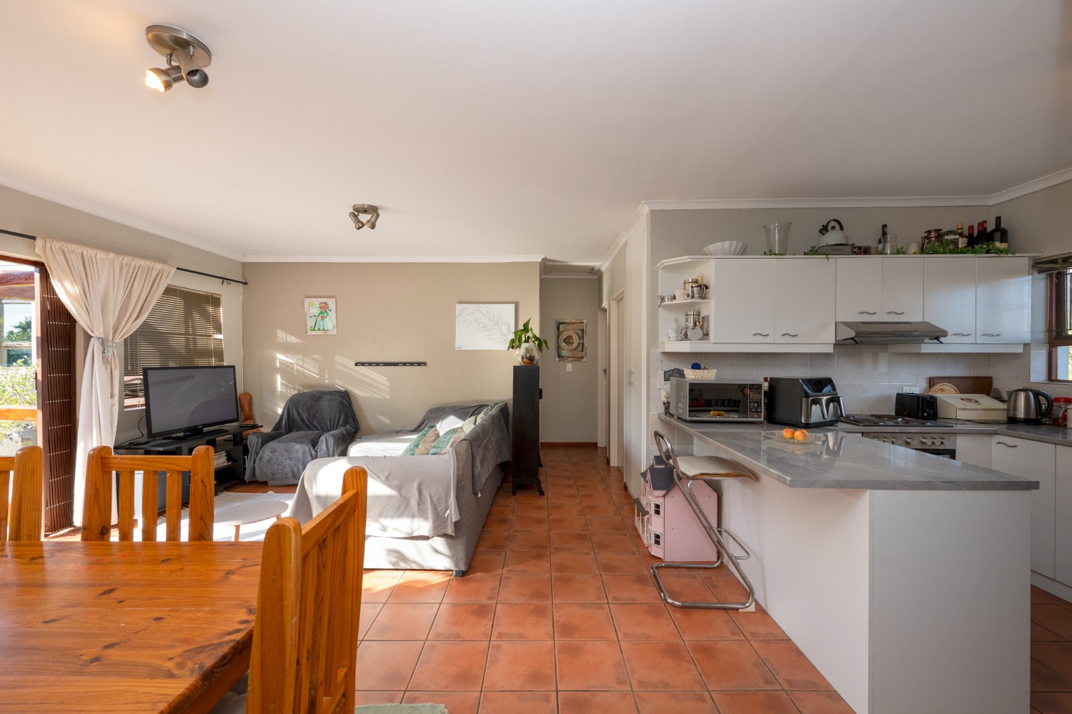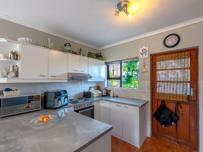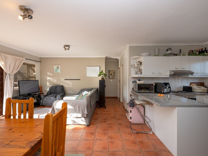 The home welcomes you with a spacious lounge and dining room, enhanced by sleek tiled flooring and doors that flow out to the garden, creating a natural flow between indoor and outdoor living. The modern kitchen is both practical and inviting, featuring built-in cupboards, an under-counter oven and hob, a double sink, and a space for a fridge.