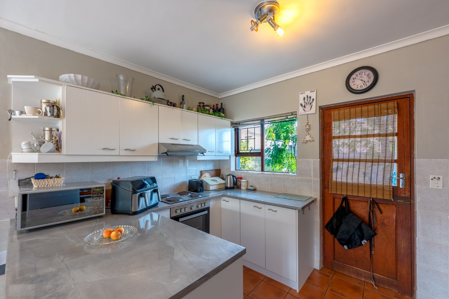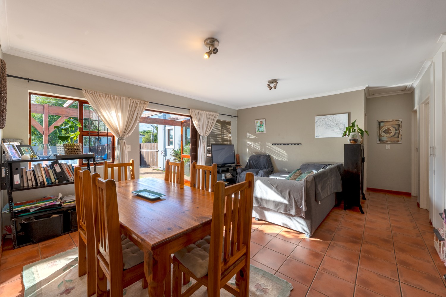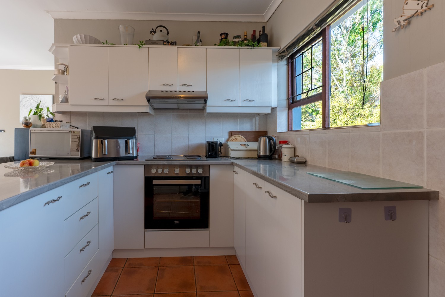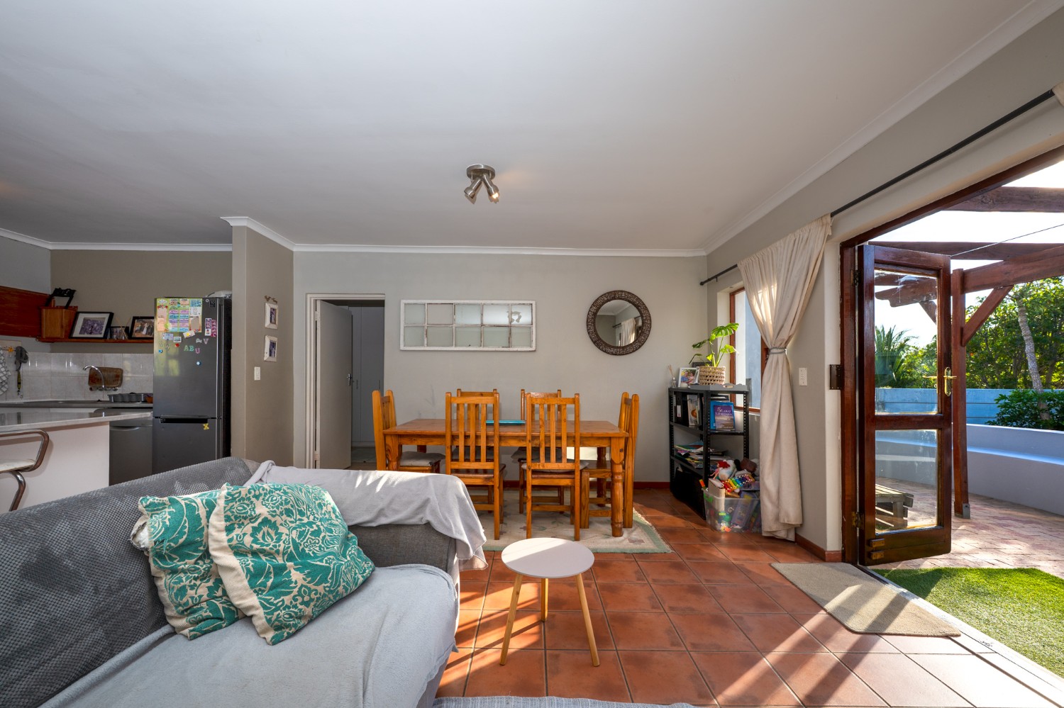 The home welcomes you with a spacious lounge and dining room, enhanced by sleek tiled flooring and doors that flow out to the garden, creating a natural flow between indoor and outdoor living. The modern kitchen is both practical and inviting, featuring built-in cupboards, an under-counter oven and hob, a double sink, and a space for a fridge.