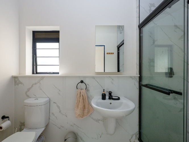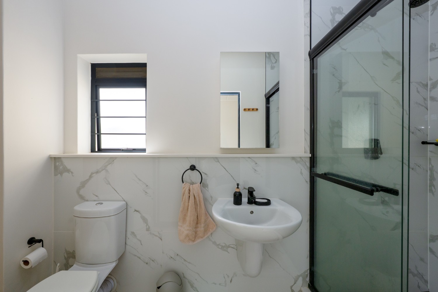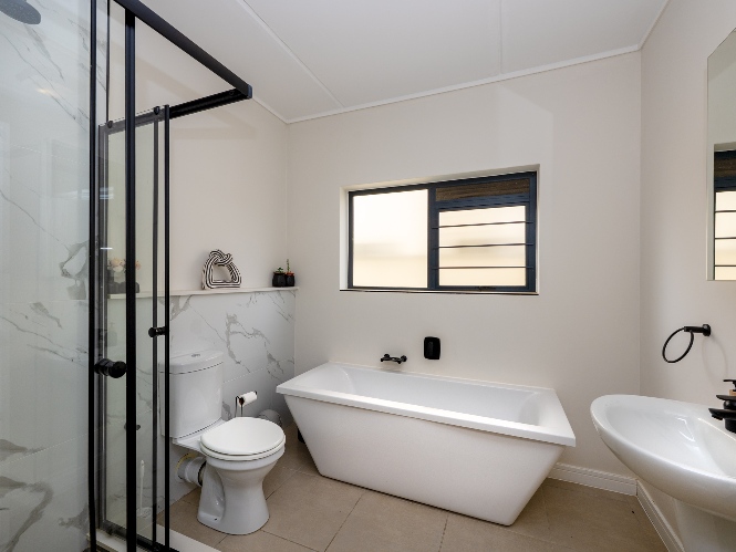 All three bedrooms are generously sized and fitted with built-in cupboards, offering plenty of storage while creating a comfortable retreat. The main bedroom features a stylish en-suite bathroom complete with a shower, basin, and toilet. The family bathroom is beautifully finished and well-appointed, with a bathtub and shower, a basin, and a toilet.