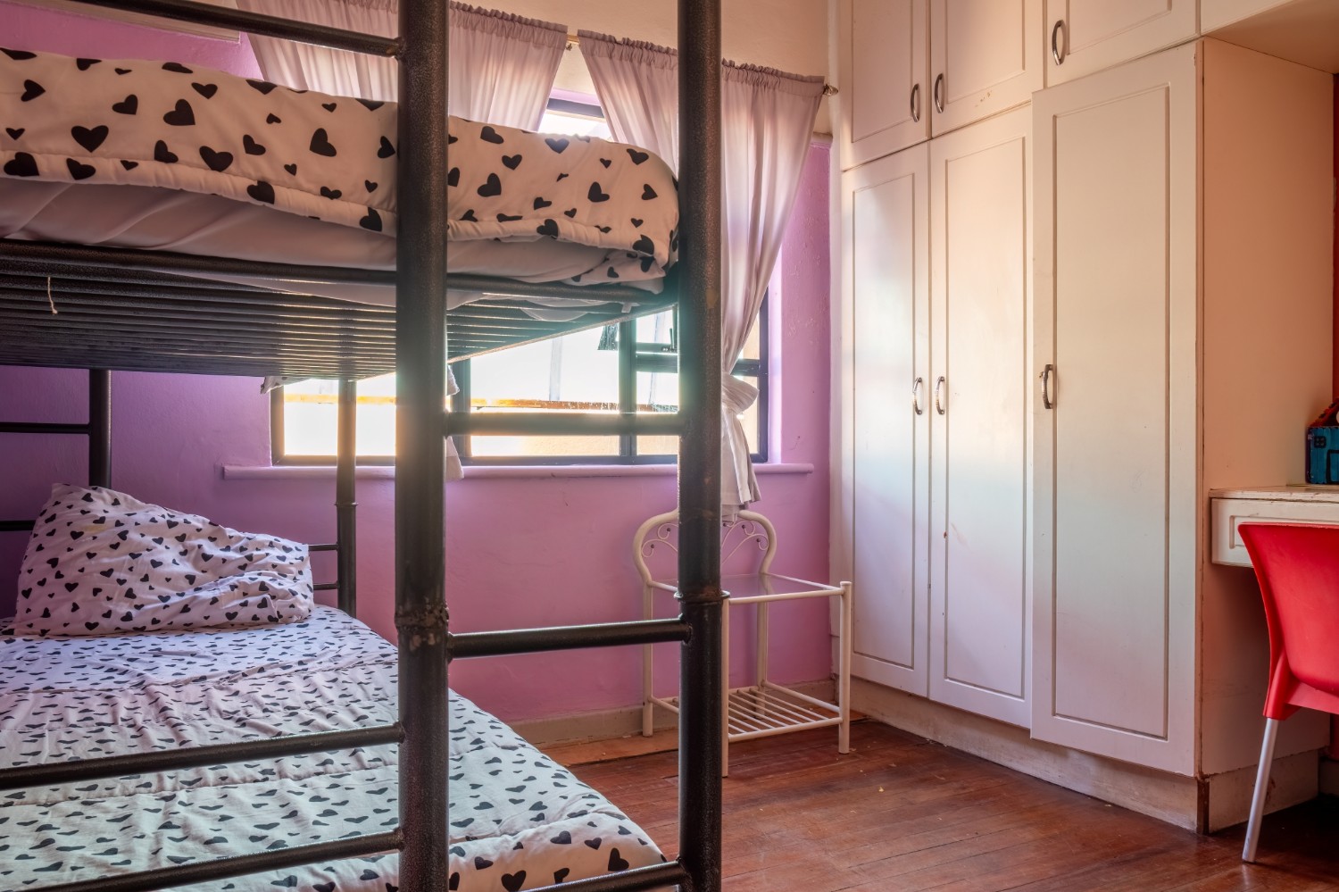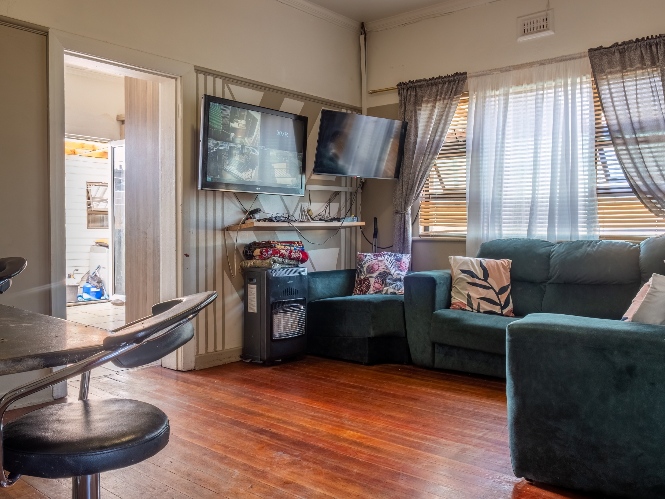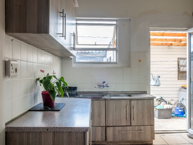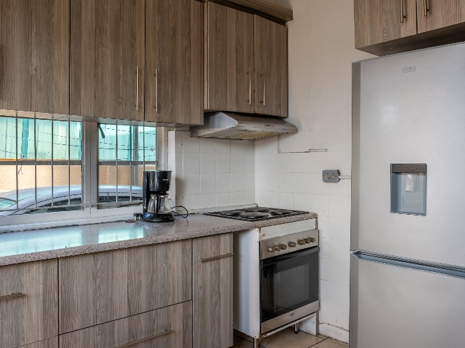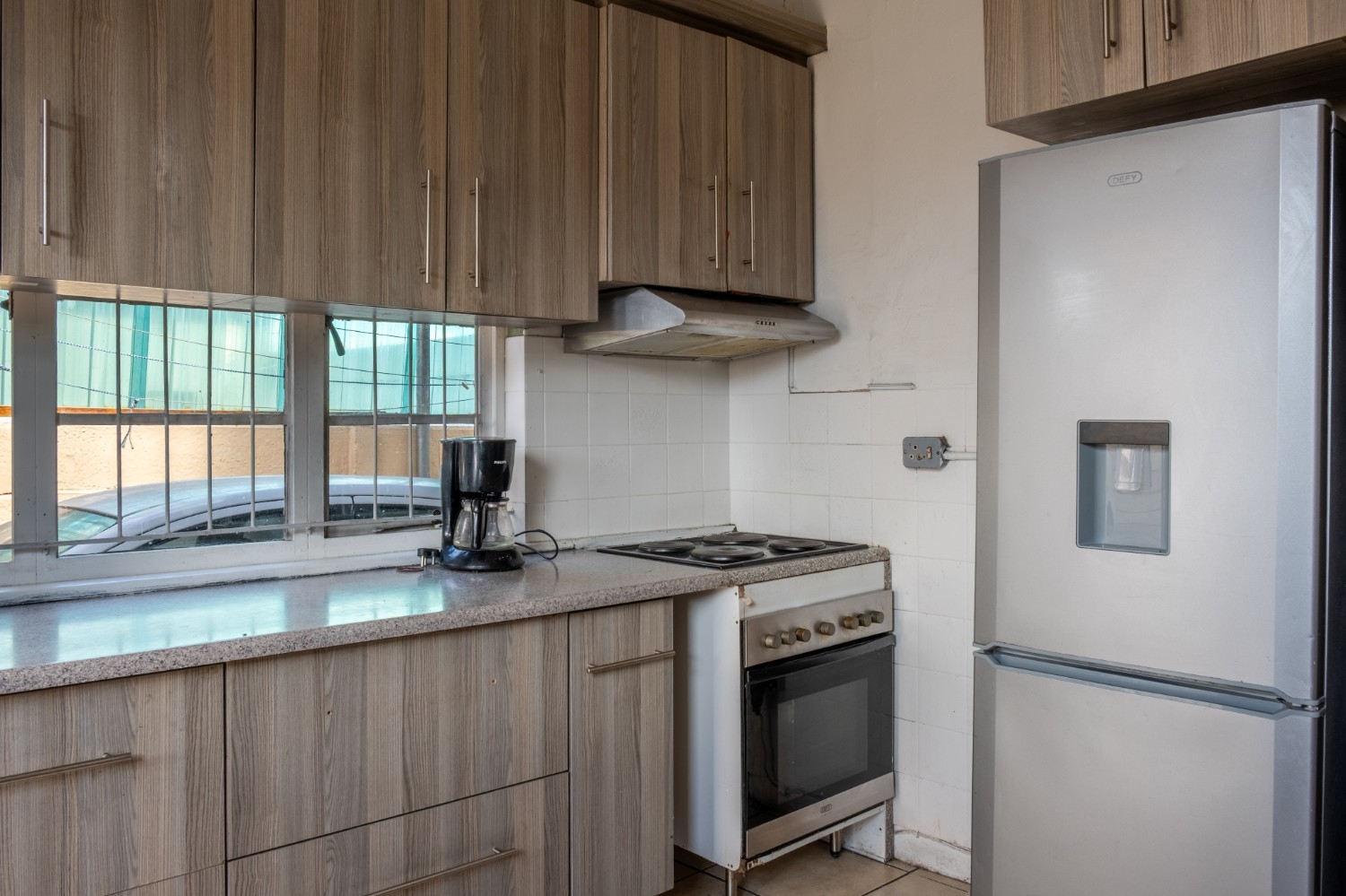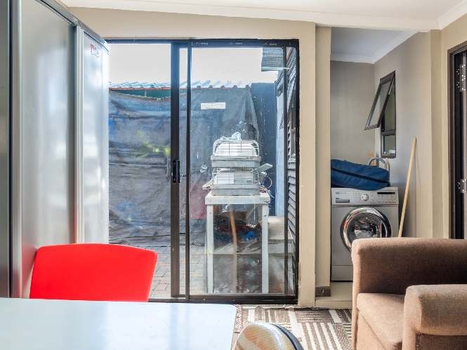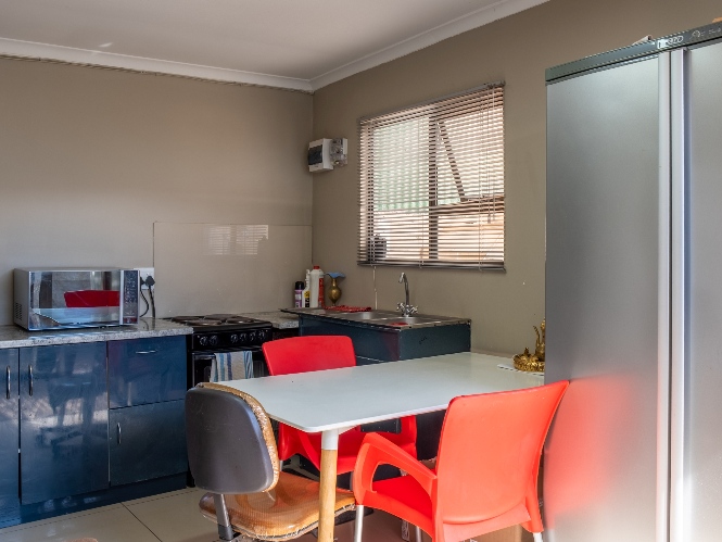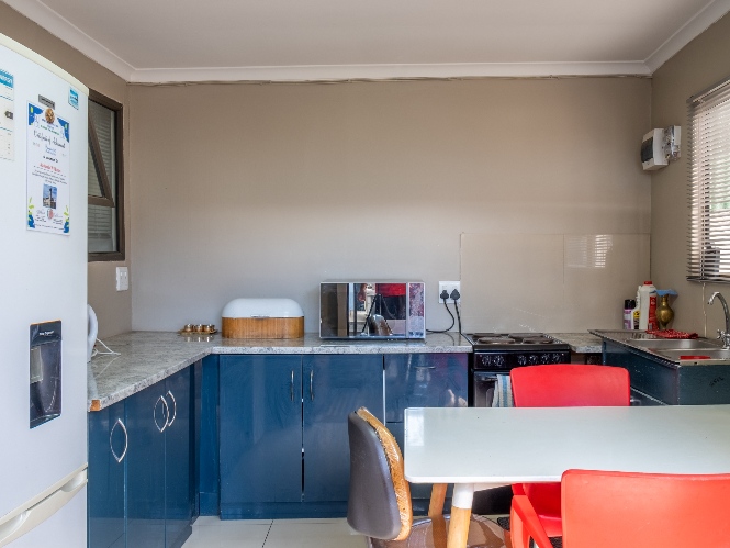 Upon arrival, you are welcomed into an open-plan lounge and dining area. The kitchen offers built-in cupboards, providing convenient storage space.