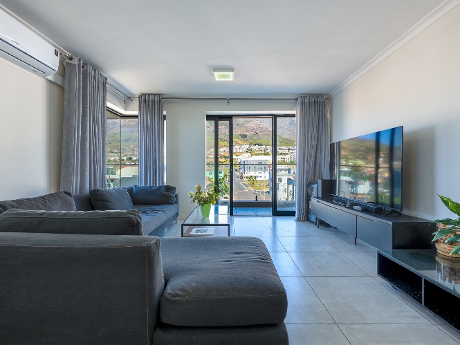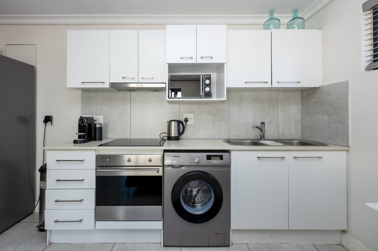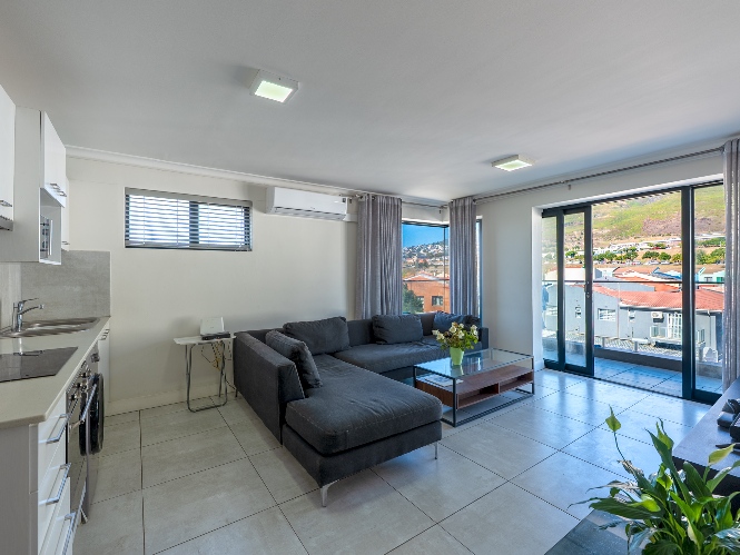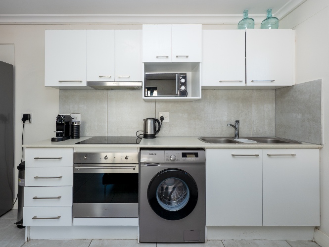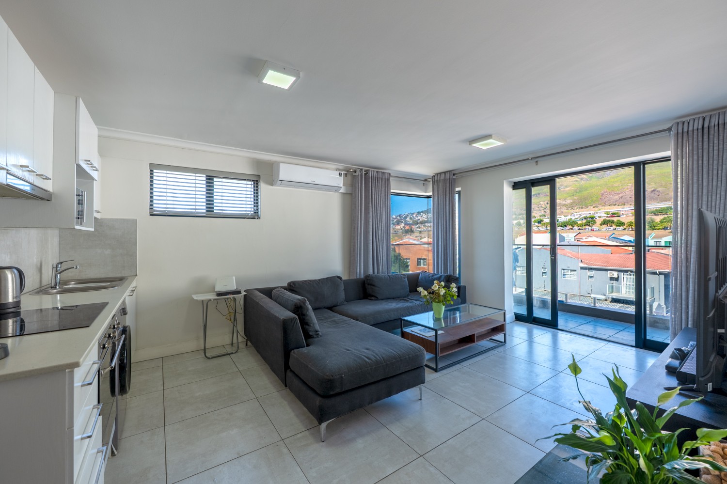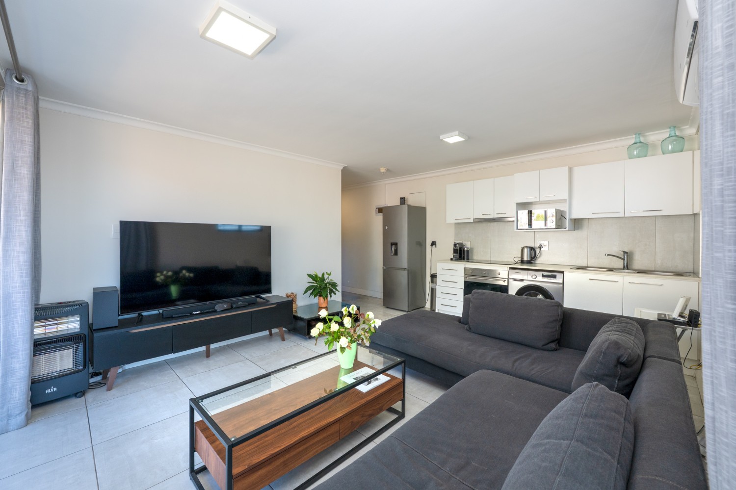 The open-plan lounge and kitchen create a light and functional living space. The kitchen is fitted with an electric oven and hob, complemented by ample storage cabinetry. Aluminium windows and doors enhance the modern feel while offering durability and low maintenance.