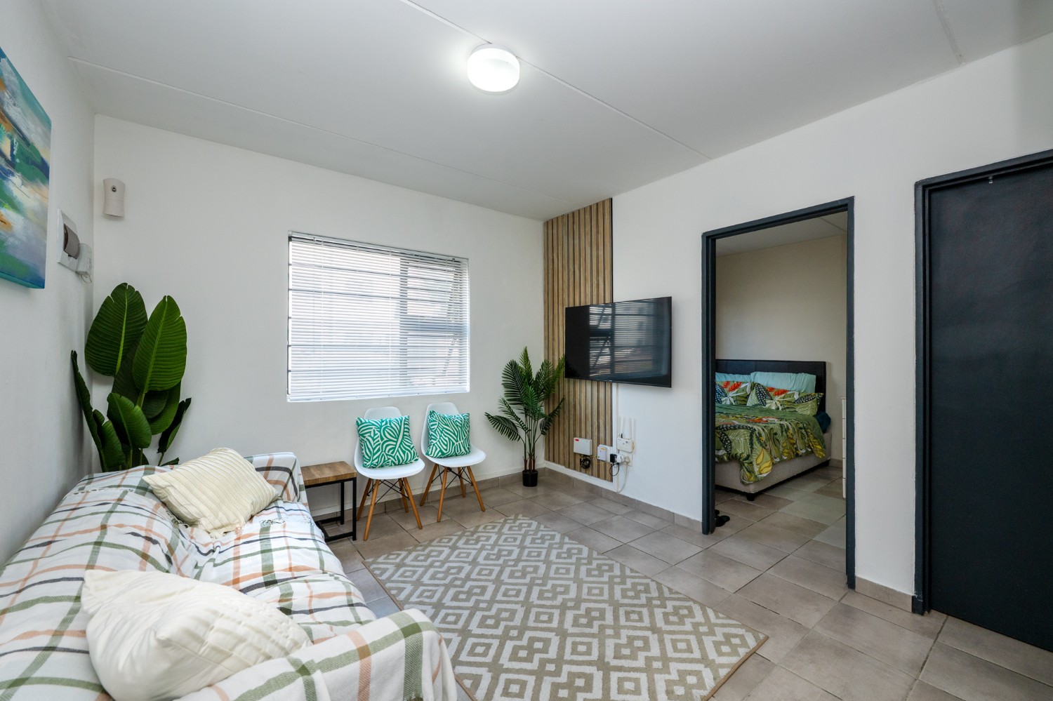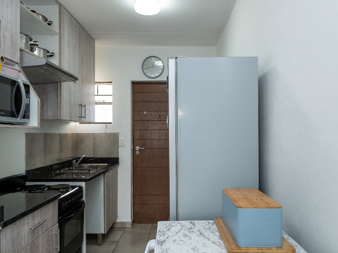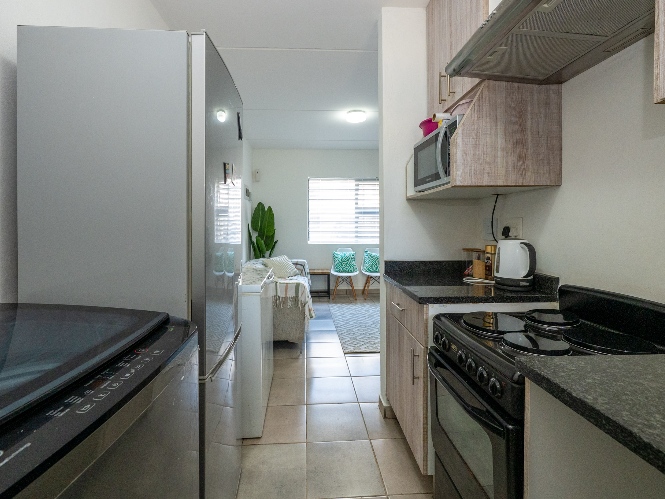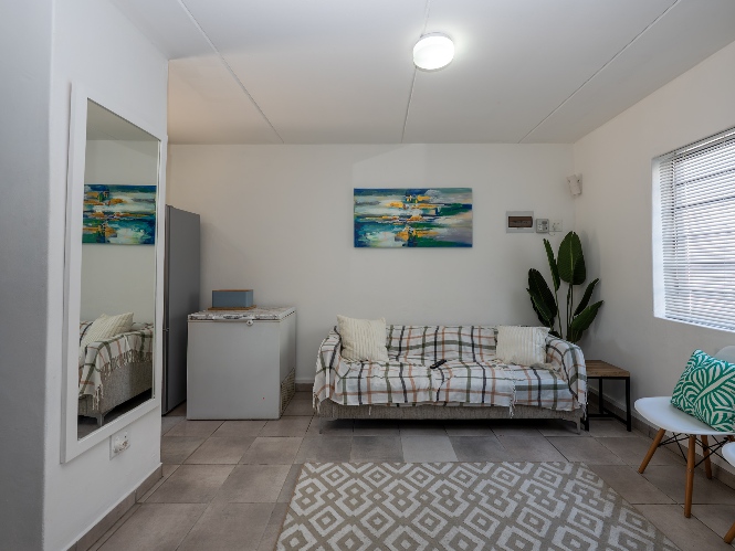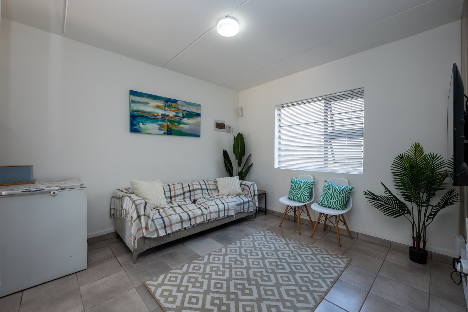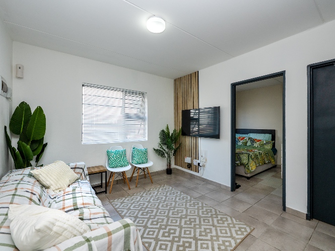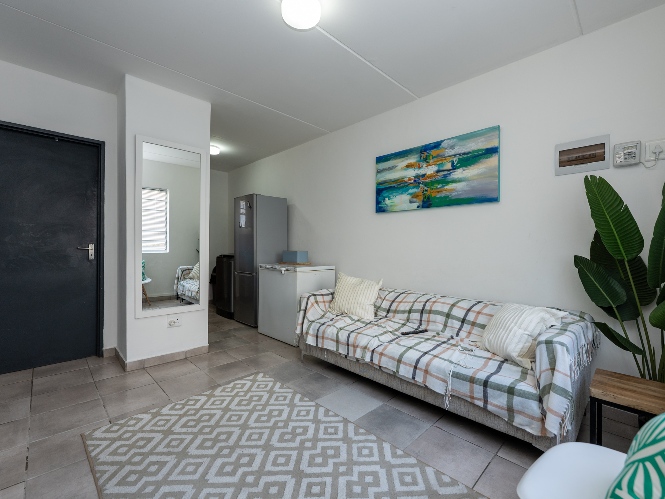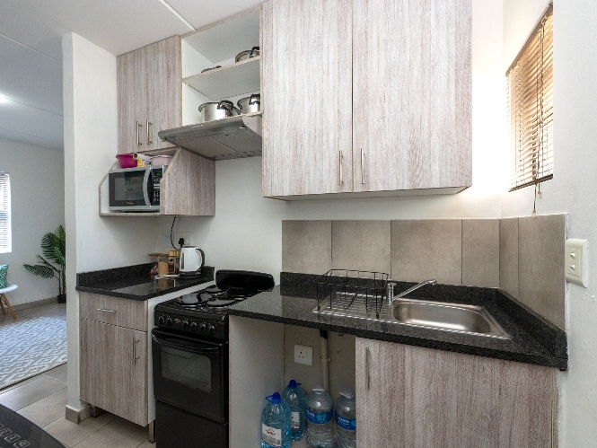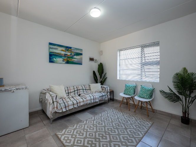 Step inside and be welcomed by a bright and airy lounge, beautifully finished with tiled flooring and filled with natural light that creates a relaxed and homely atmosphere. The charming kitchen is thoughtfully designed with built-in cupboards, granite countertops, a stove and oven, a plumbing point, and space for a fridge, making everyday living both practical and enjoyable.