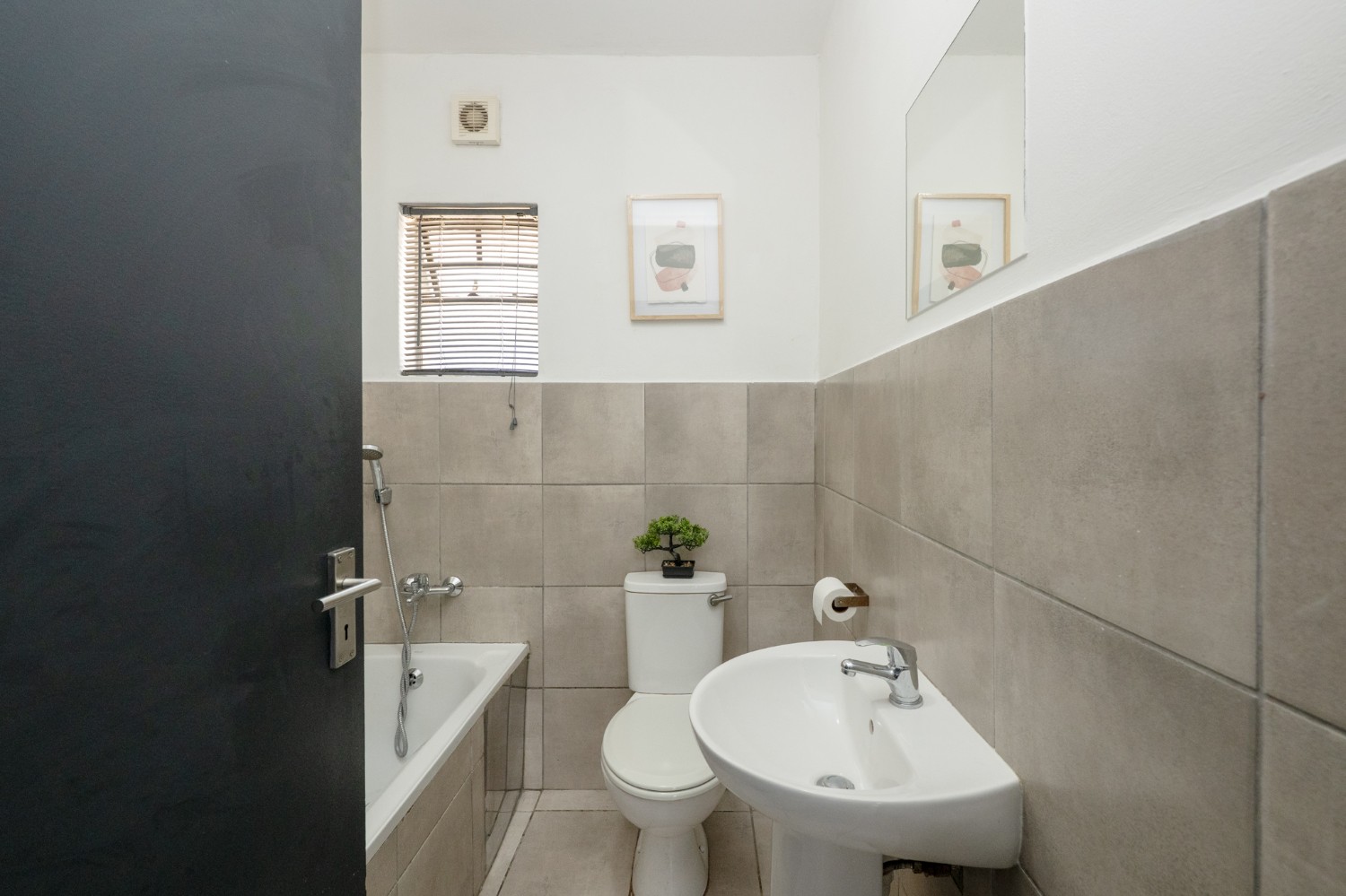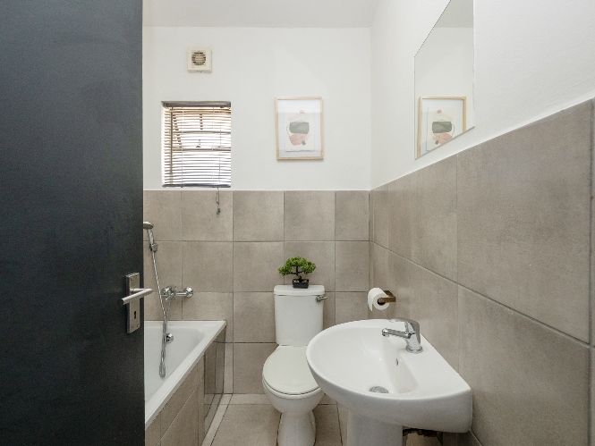 The apartment features two generously sized bedrooms, both fitted with built-in cupboards to provide ample storage space. The bathroom is neatly tiled and equipped with a bathtub with a showerhead, a basin, and a toilet, perfect for both quick mornings and relaxing evenings.