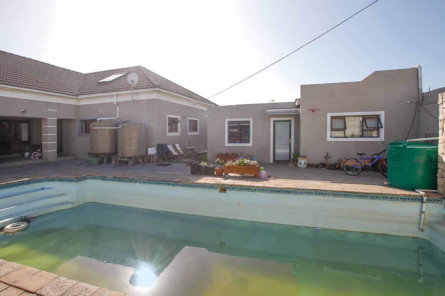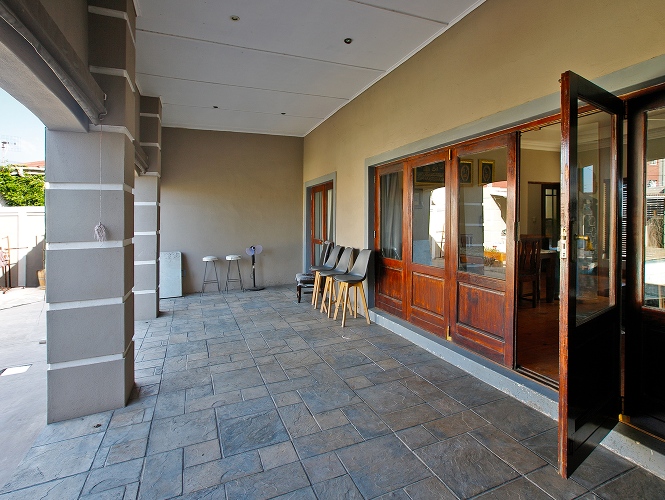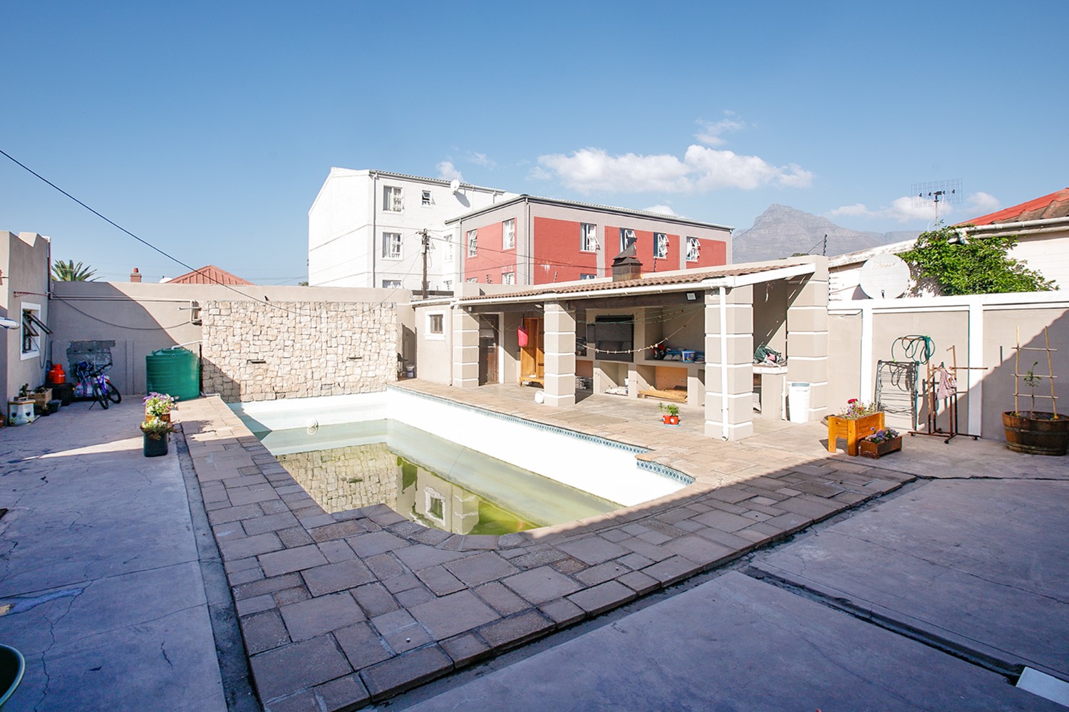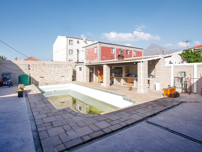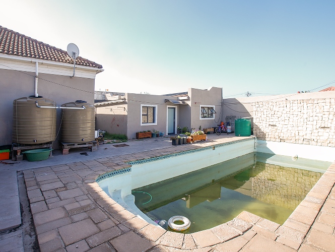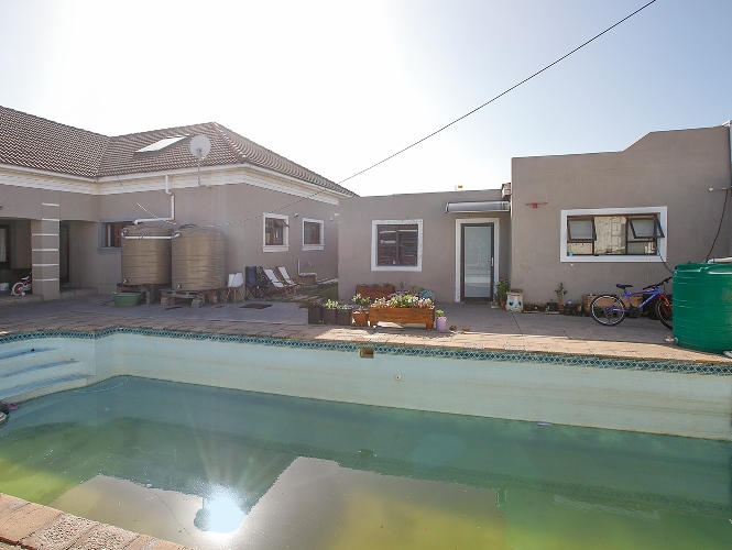 Step outside to a well-designed entertainment area, complete with a swimming pool and a covered braai space, perfect for hosting family and friends. A storage room is conveniently positioned behind the braai area, along with an additional outdoor toilet and shower.