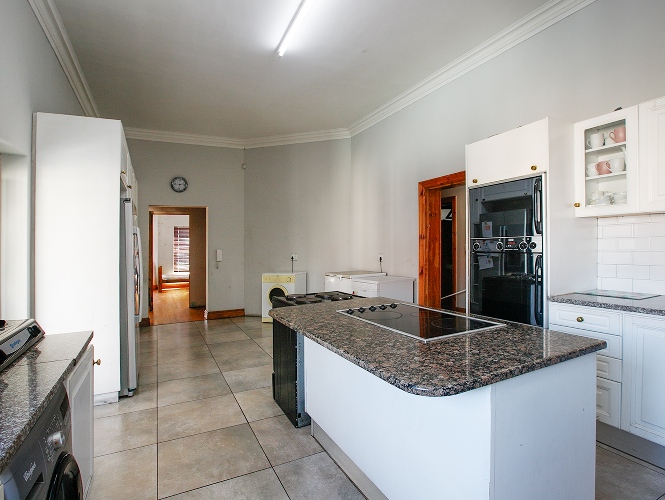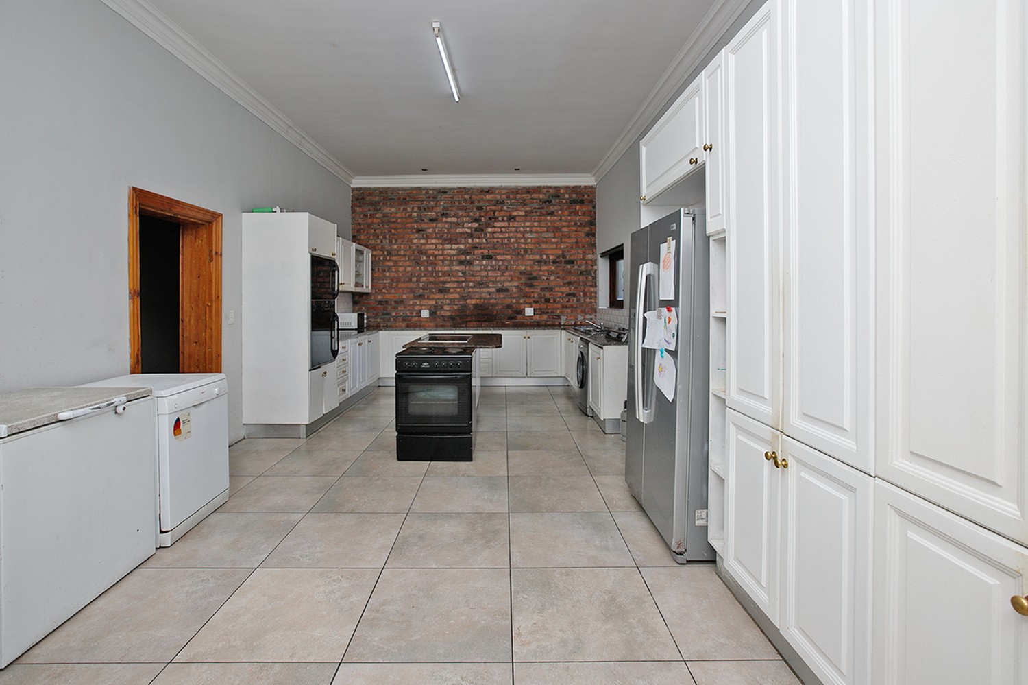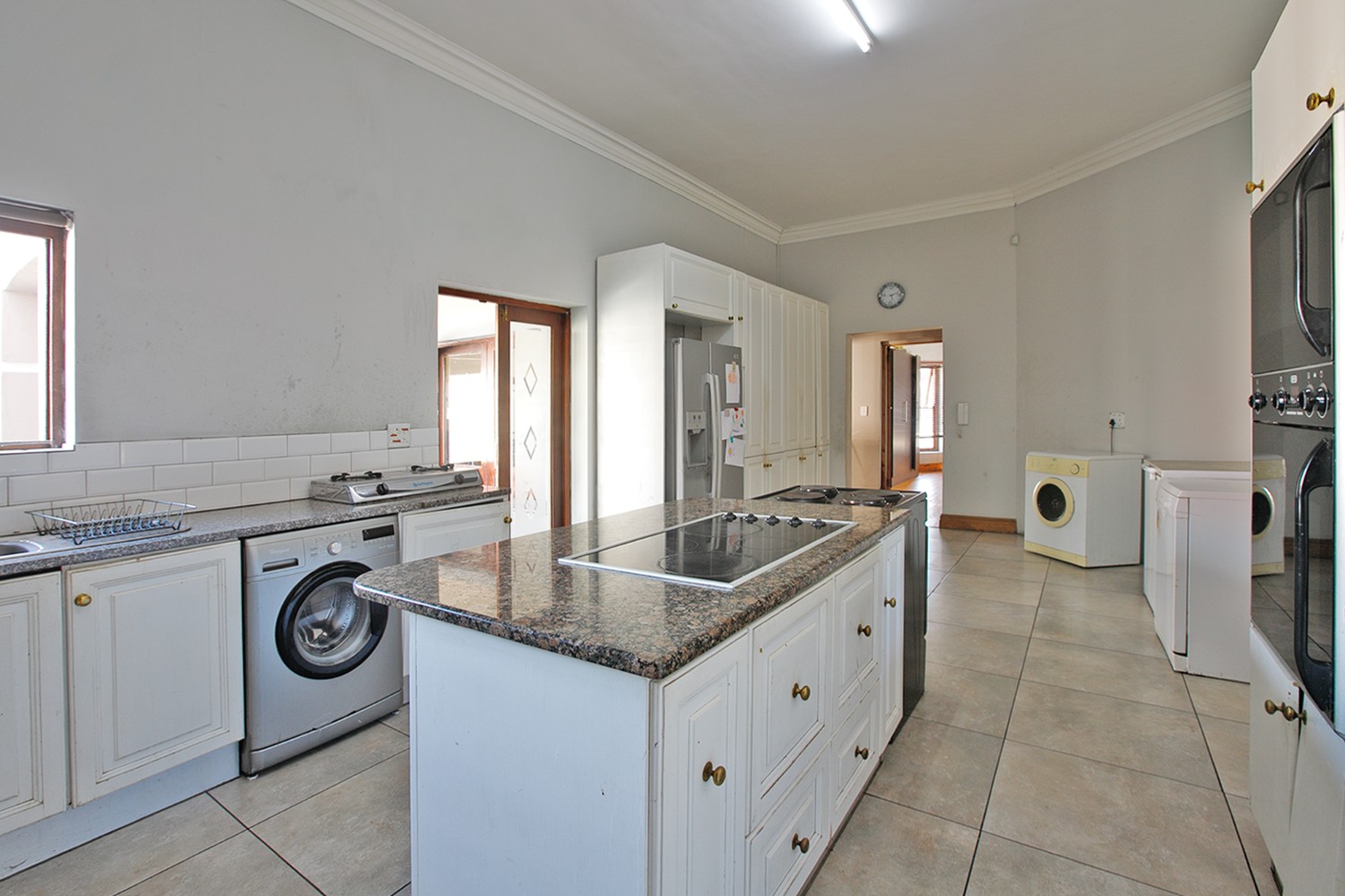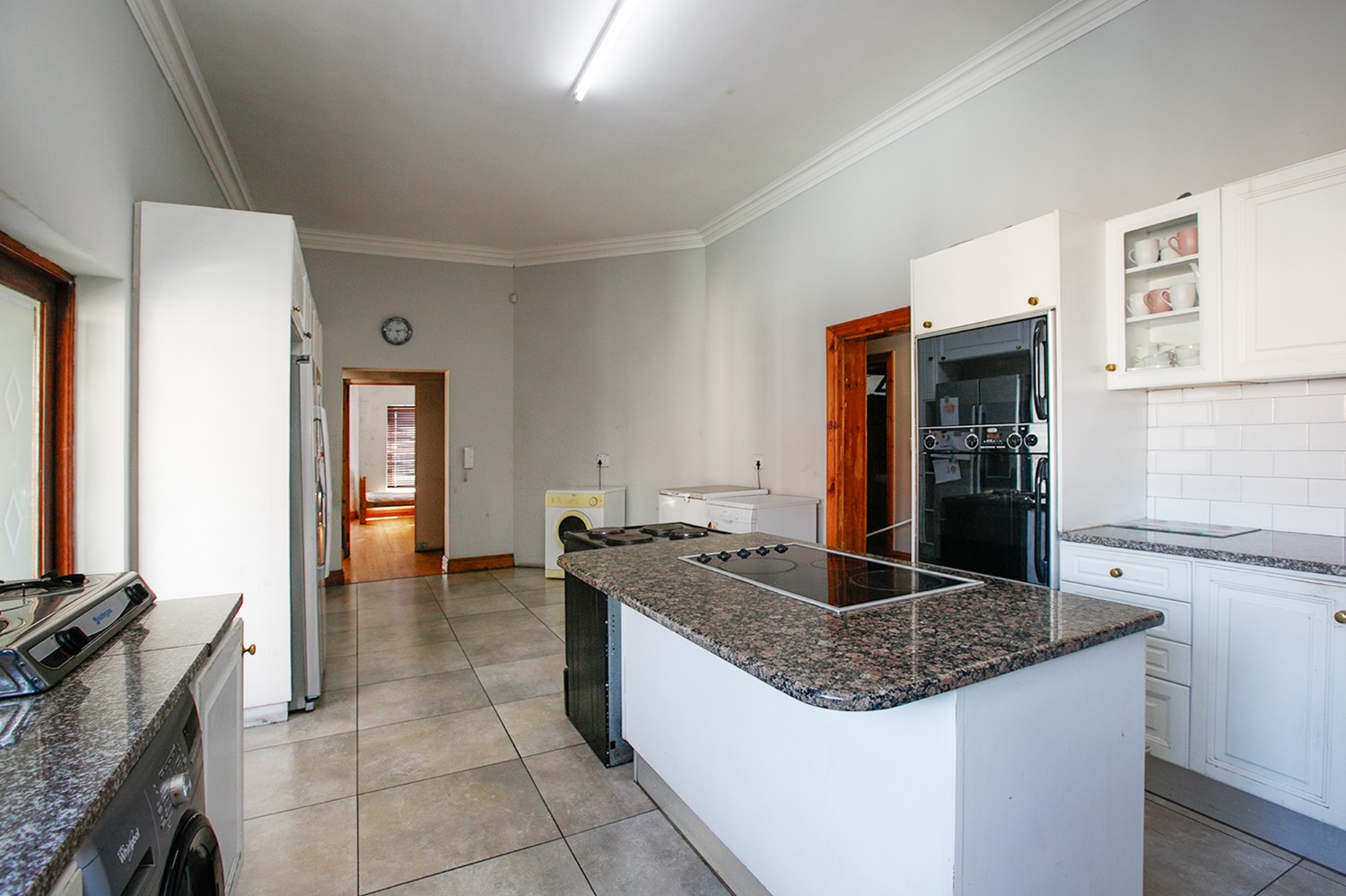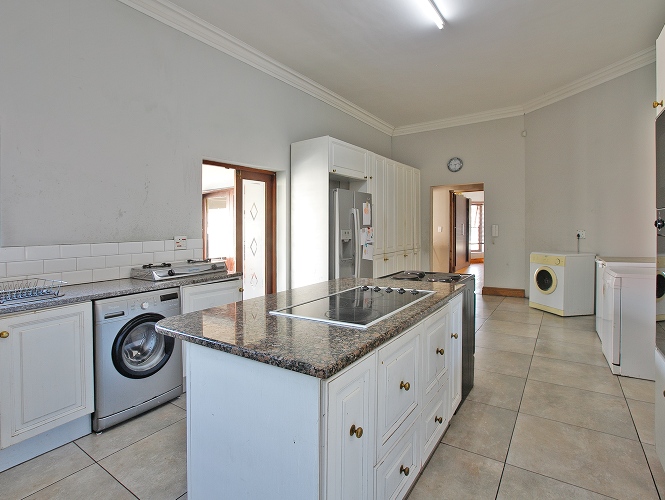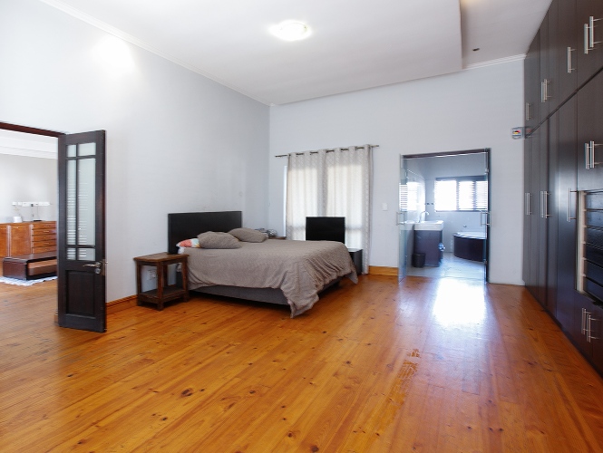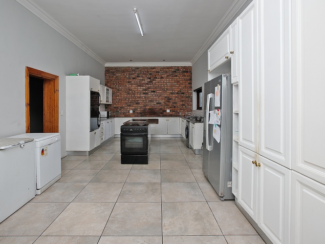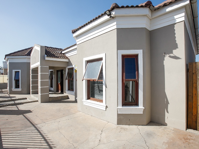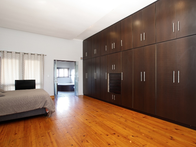 Welcomed by a double garage at the front, the home opens into a generously sized interior with five bedrooms in total. The main bedroom includes built-in cupboards and a private en-suite bathroom. A second bedroom, currently created with drywall, forms part of an extension to the very large lounge area, offering flexibility for use as a bedroom, office, or additional living space.