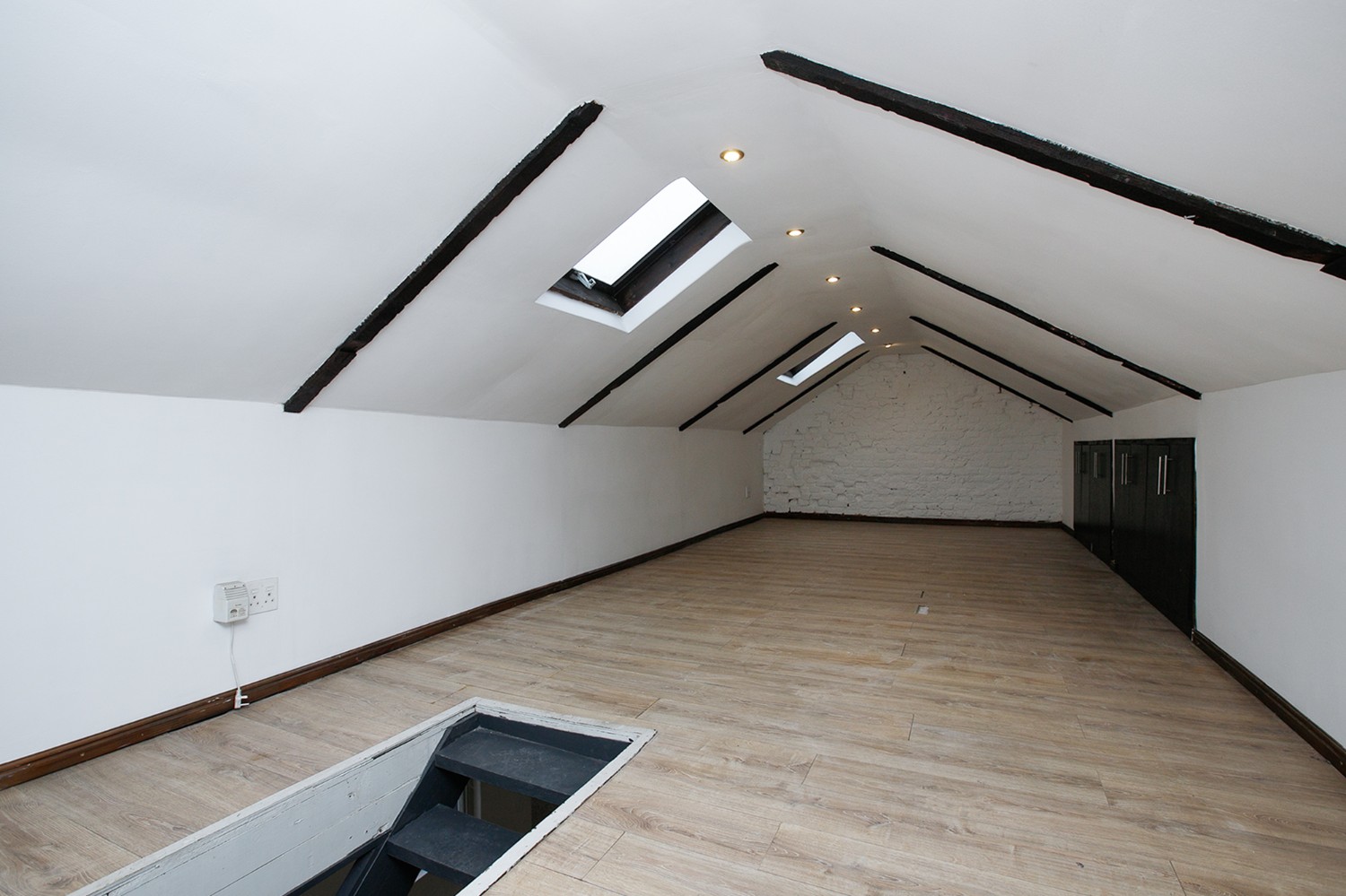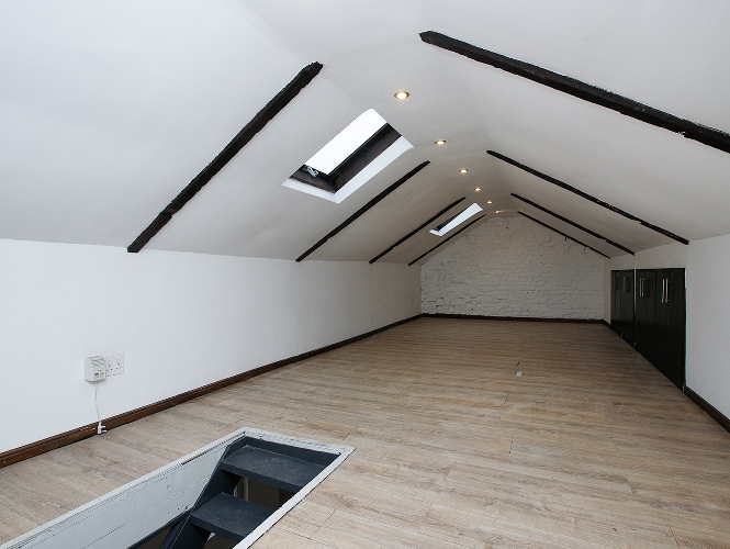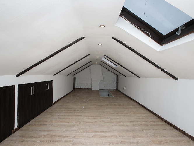 The home comprises three well-sized bedrooms, all equipped with built-in cupboards. The third bedroom is a spacious loft-style retreat, complete with a skylight that fills the room with natural light, adding a unique and airy feel.