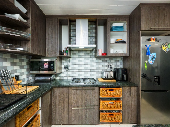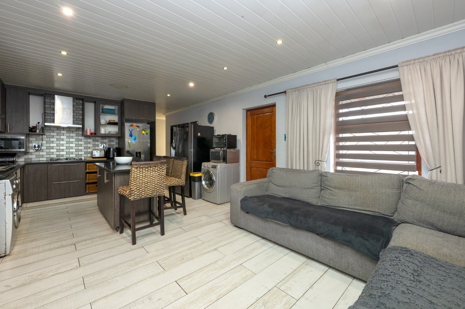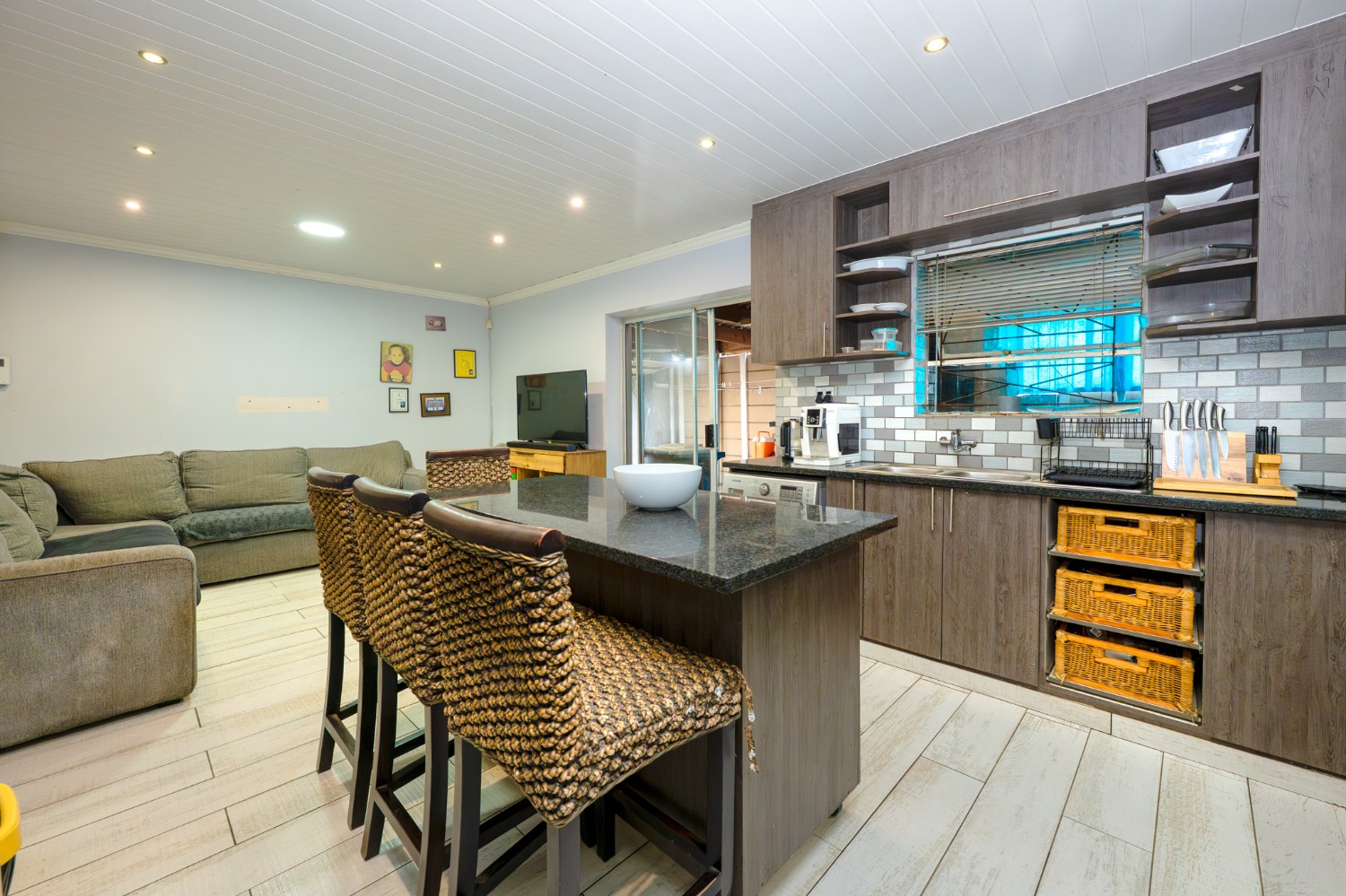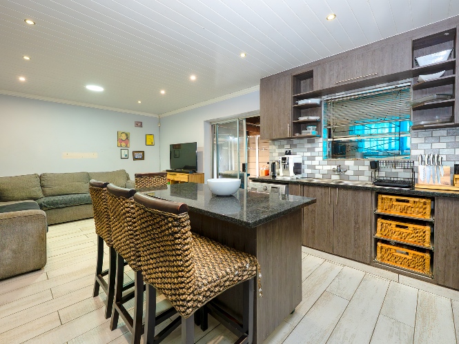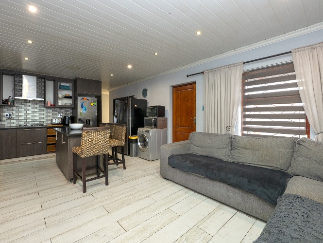 Step inside to an open-plan lounge and kitchen designed for easy living. The lounge features large windows that allow for plenty of natural light, creating a warm and inviting atmosphere. The modern kitchen is fitted with dark wood cupboards, granite countertops, a built-in stovetop, one plumbing point, and space for a fridge, perfect for everyday functionality.
