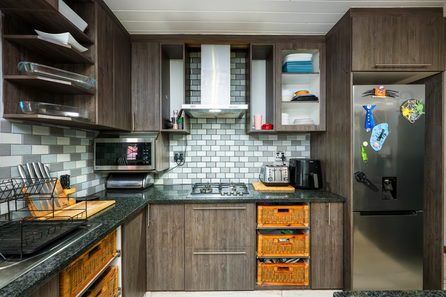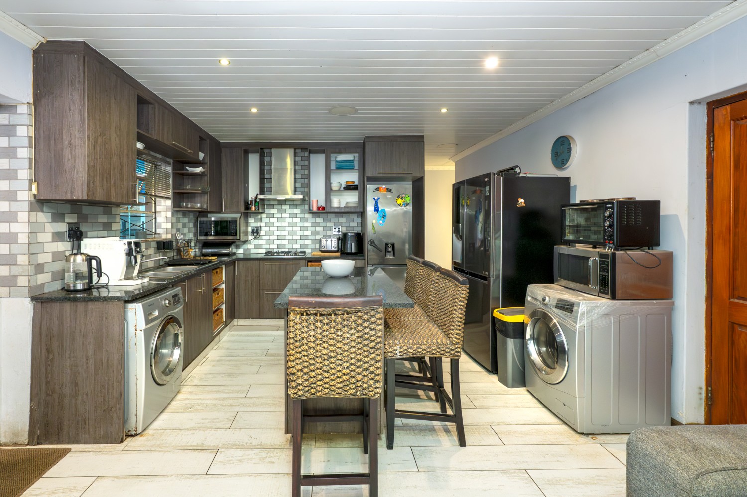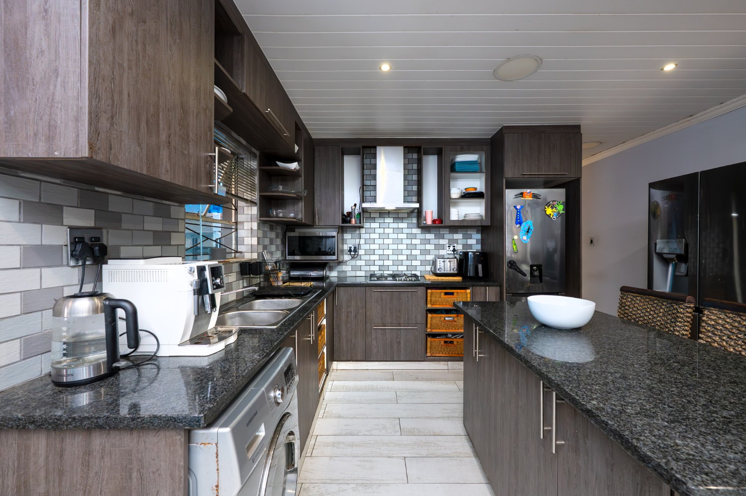 Step inside to an open-plan lounge and kitchen designed for easy living. The lounge features large windows that allow for plenty of natural light, creating a warm and inviting atmosphere. The modern kitchen is fitted with dark wood cupboards, granite countertops, a built-in stovetop, one plumbing point, and space for a fridge, perfect for everyday functionality.
