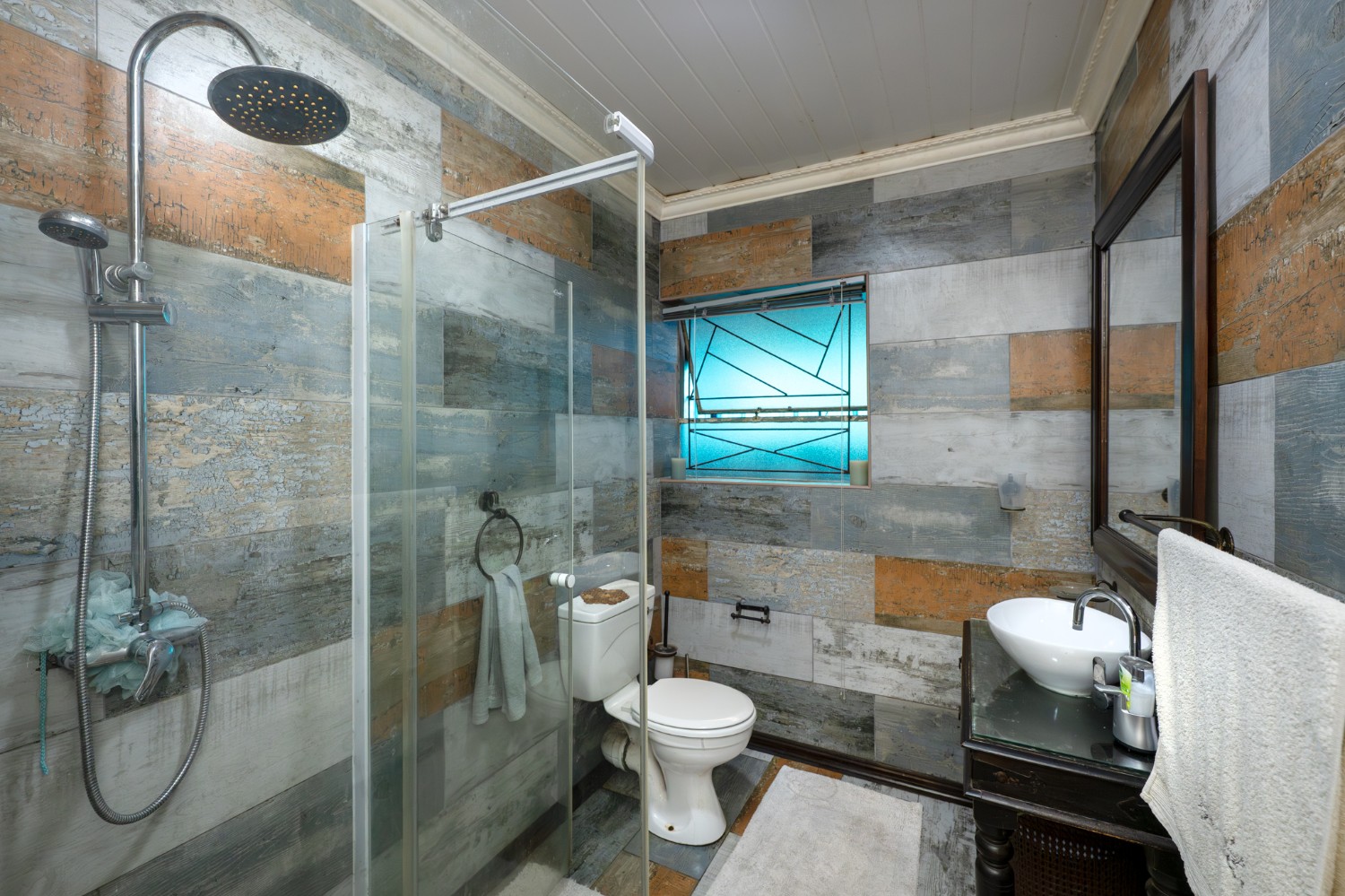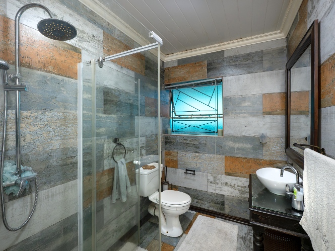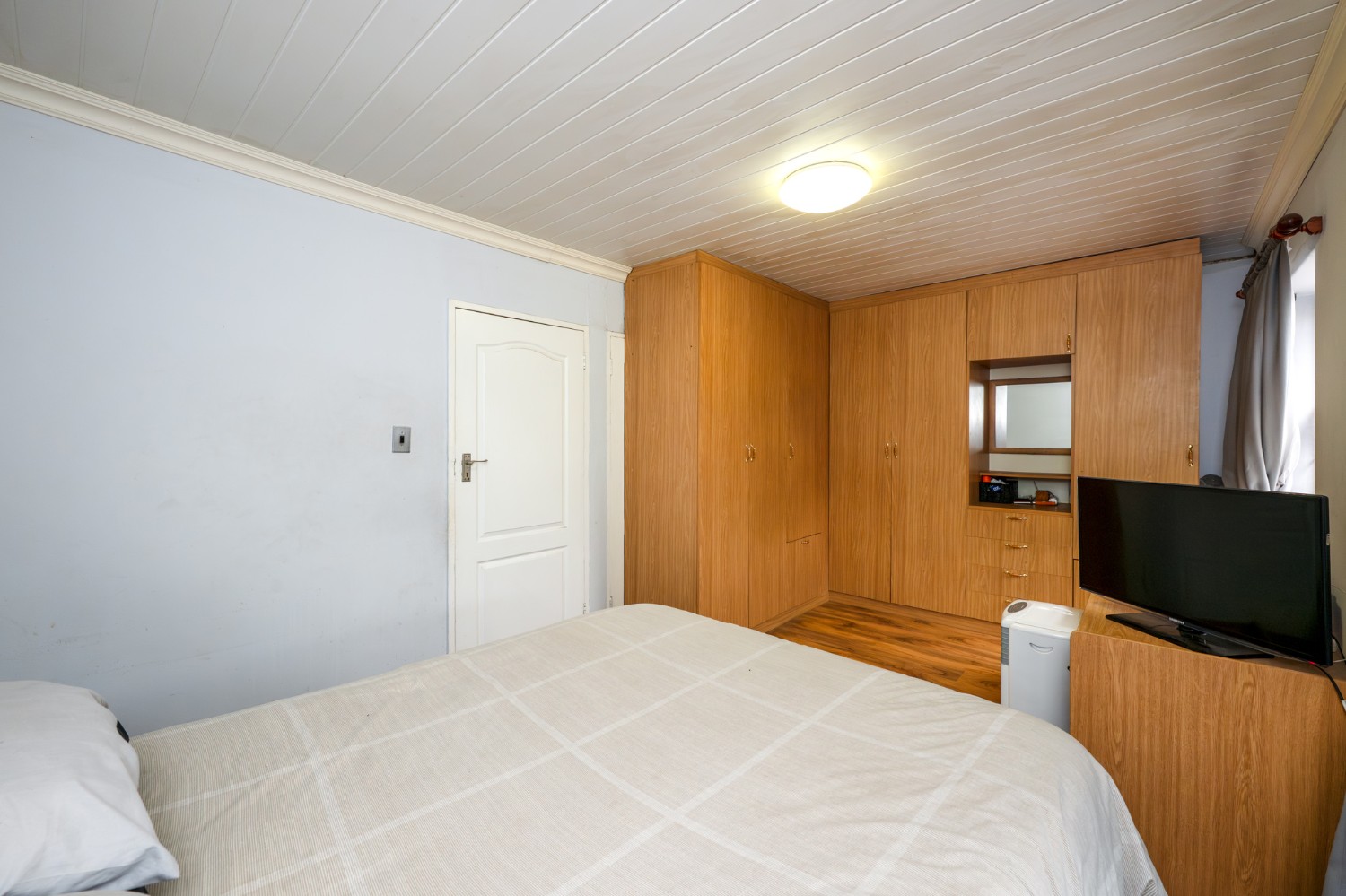 There are two generously sized bedrooms with built-in cupboards, along with neat laminated flooring for a clean, contemporary feel. The family bathroom is fully tiled with modern finishes, including a shower, basin with a toiletry cabinet, and toilet.