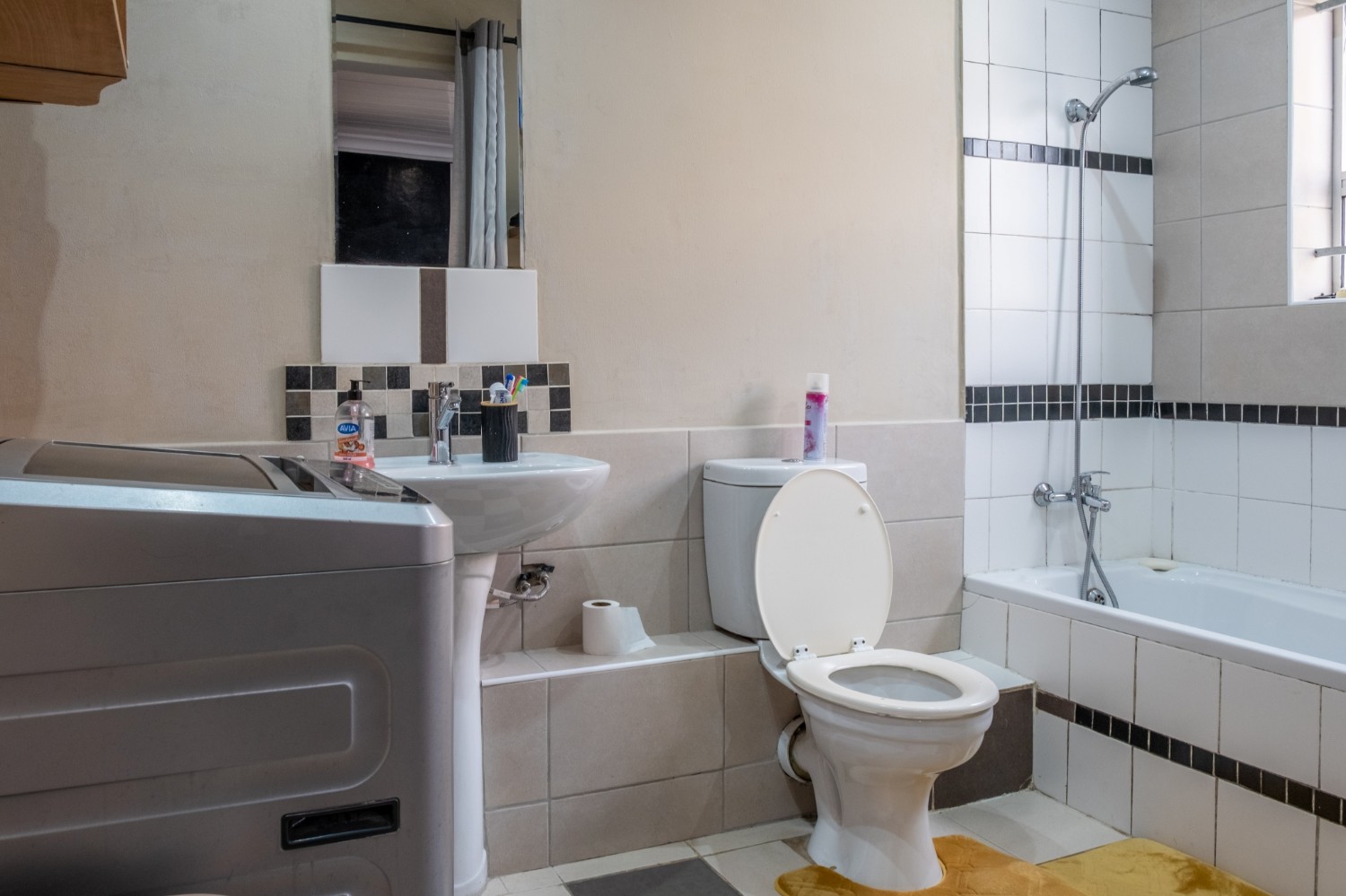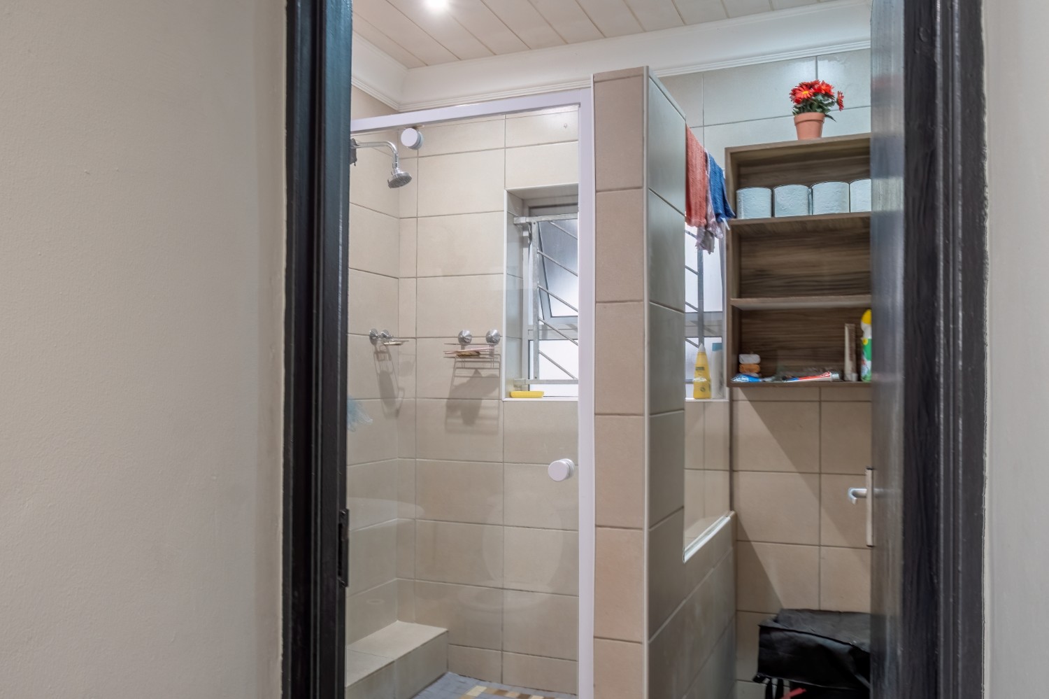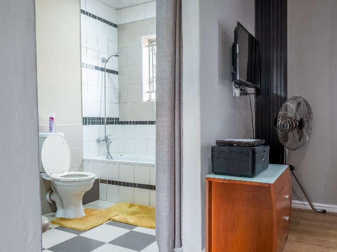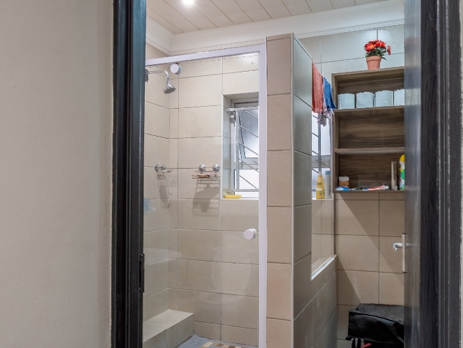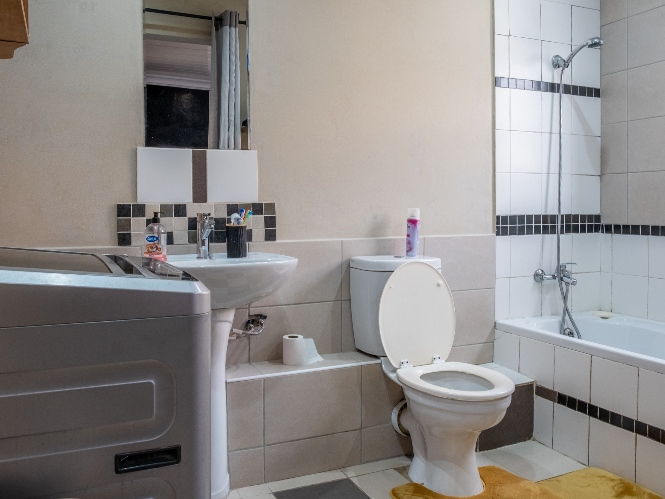 All three bedrooms are generously sized and fitted with built-in cupboards, ensuring plenty of storage. The master bedroom adds a touch of luxury with its own en-suite bathroom, featuring a bathtub with a showerhead, as well as a basin and toilet. The family bathroom is neatly tiled and complete with a shower, basin, and toilet