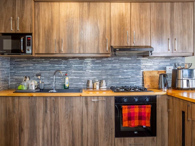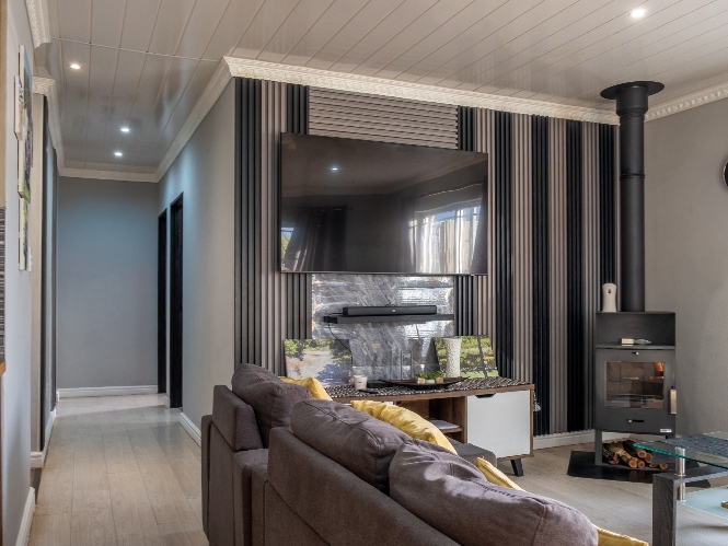 As you enter, you are welcomed by a spacious lounge featuring stylish laminated flooring and a cosy indoor fireplace perfect for relaxing evenings. A sliding door seamlessly connects the living space to the backyard, allowing natural light to flood in while creating an effortless indoor-outdoor flow. The well-sized kitchen is both functional and charming, fitted with light wood cupboards, a built-in oven, and a gas stovetop. There is ample space to accommodate a dining table, making it the ideal setting for family meals and entertaining guests.