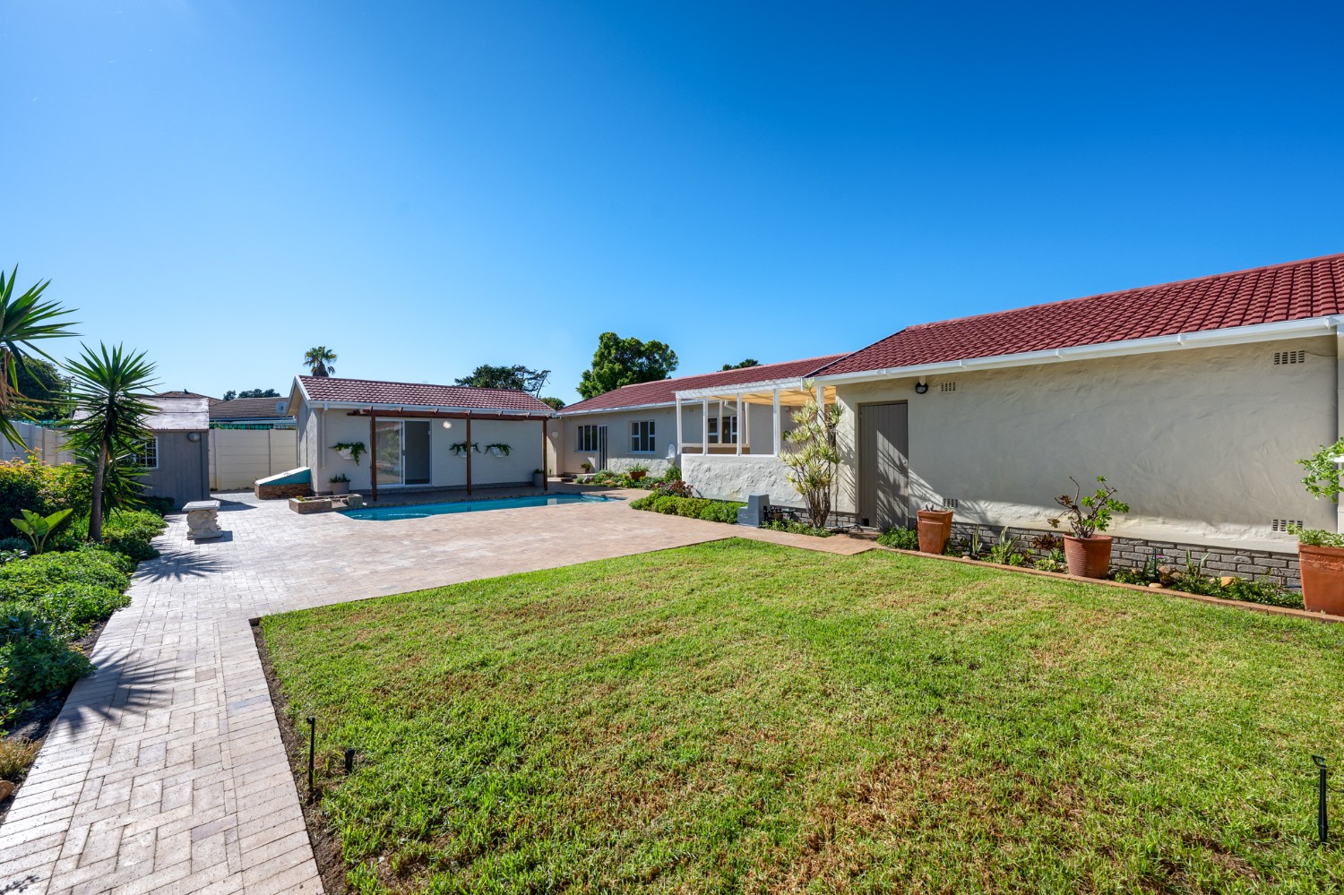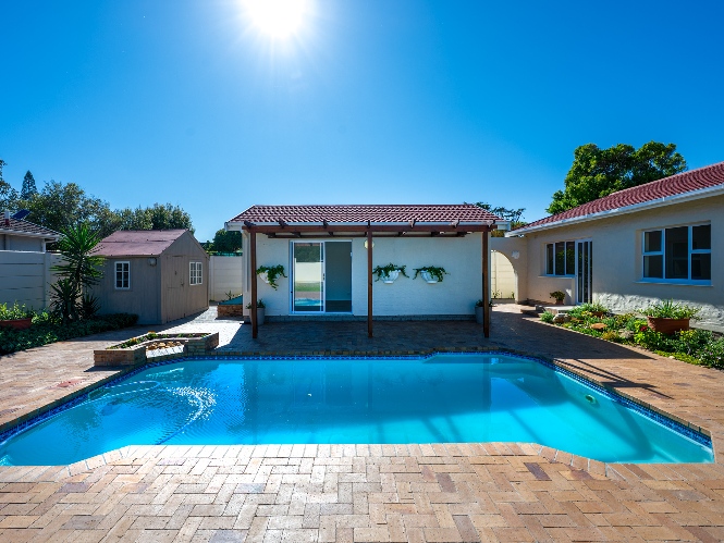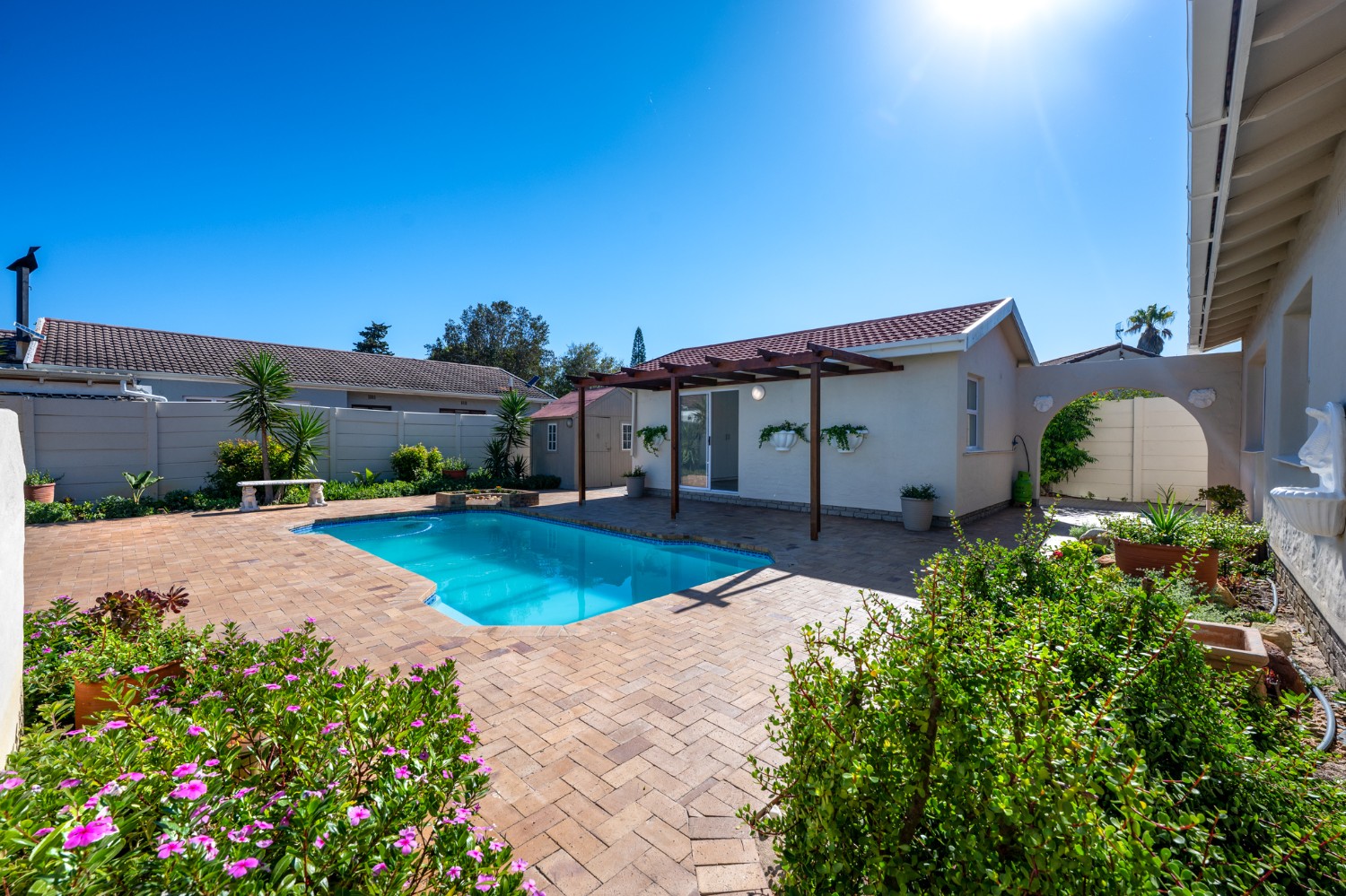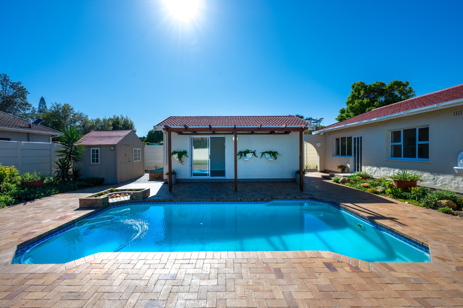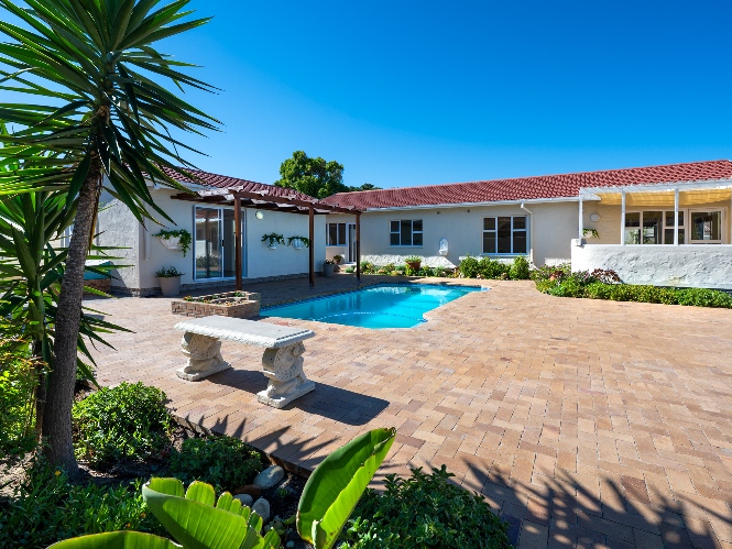 Step outside to enjoy a sparkling pool set within a large, low-maintenance garden, providing the perfect space for relaxation and outdoor entertaining.