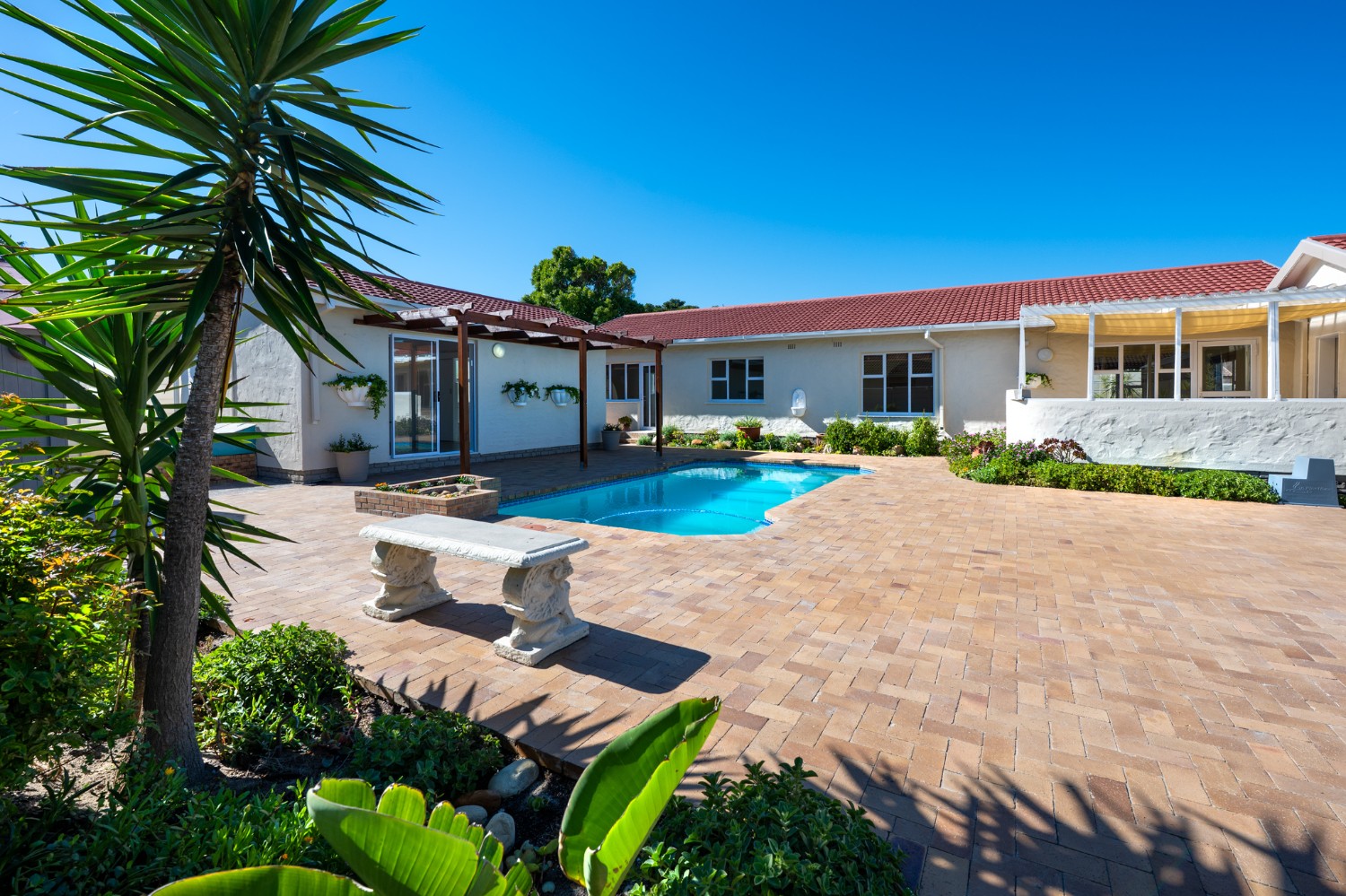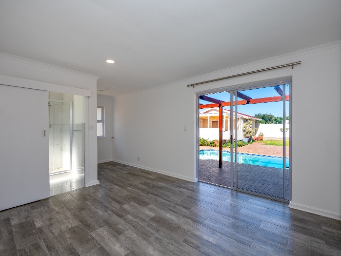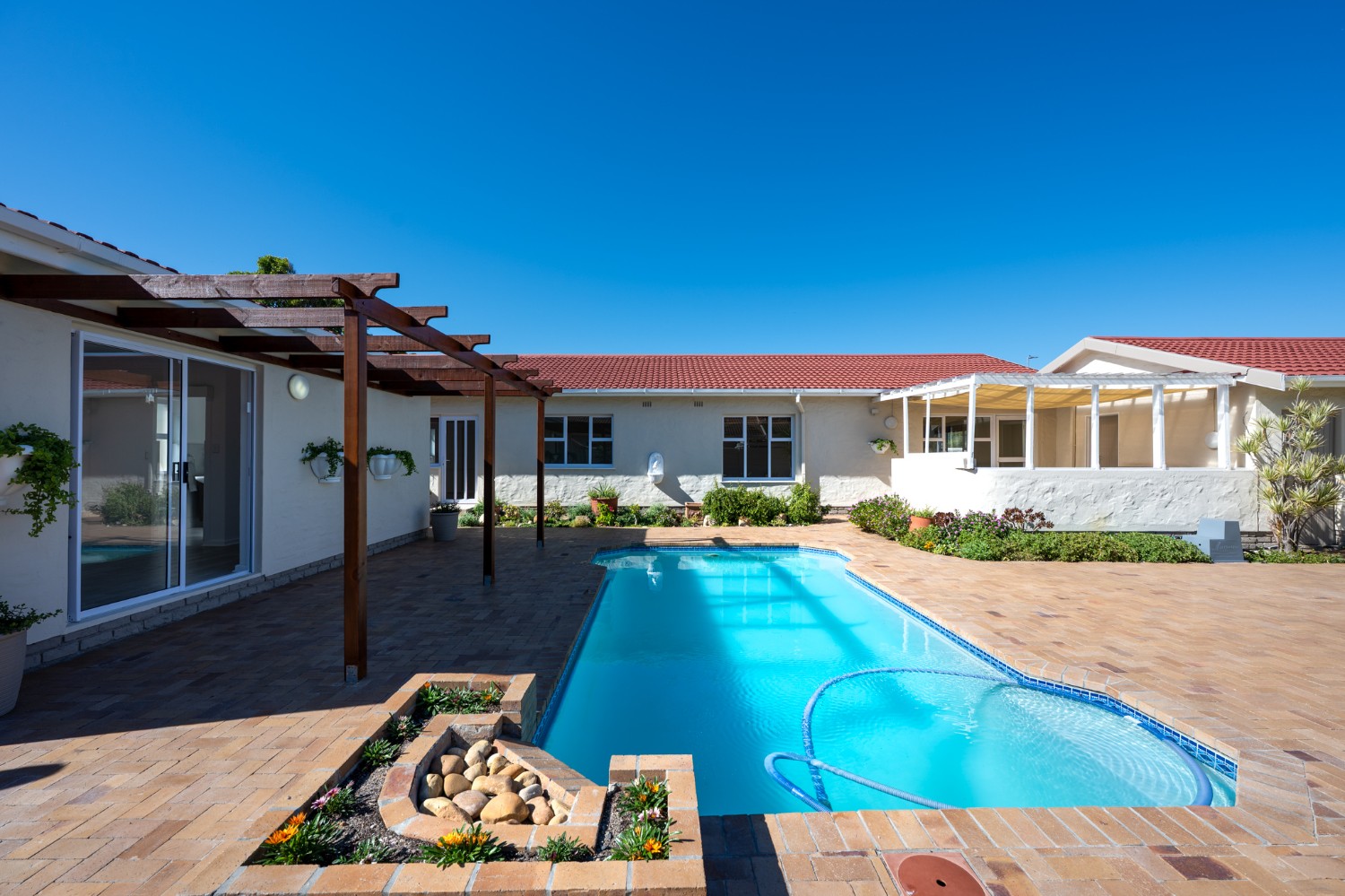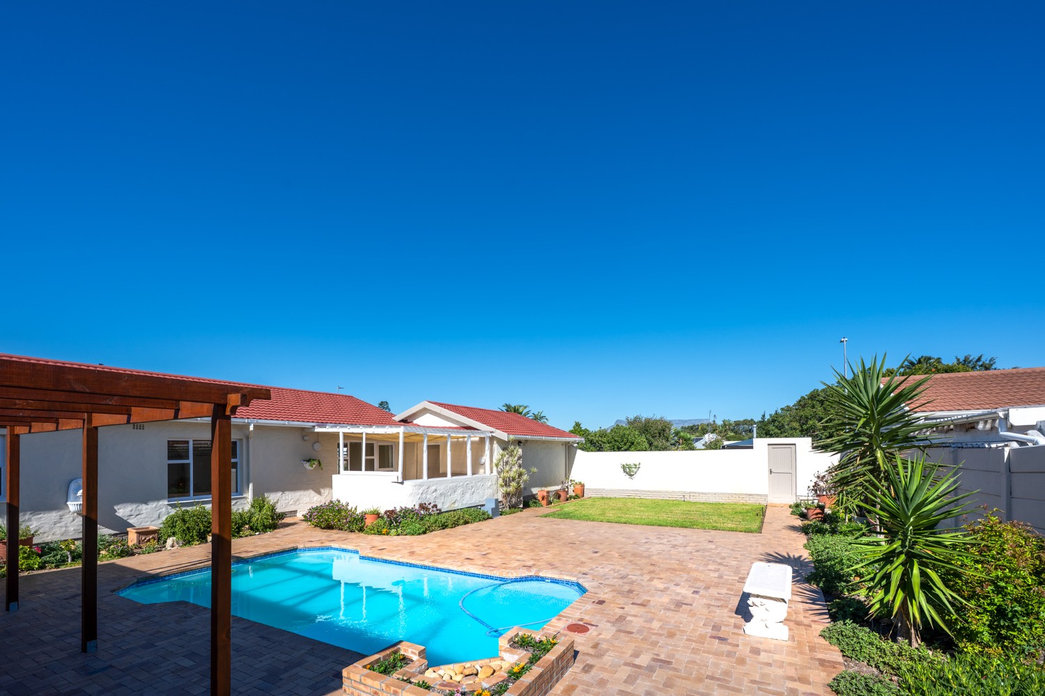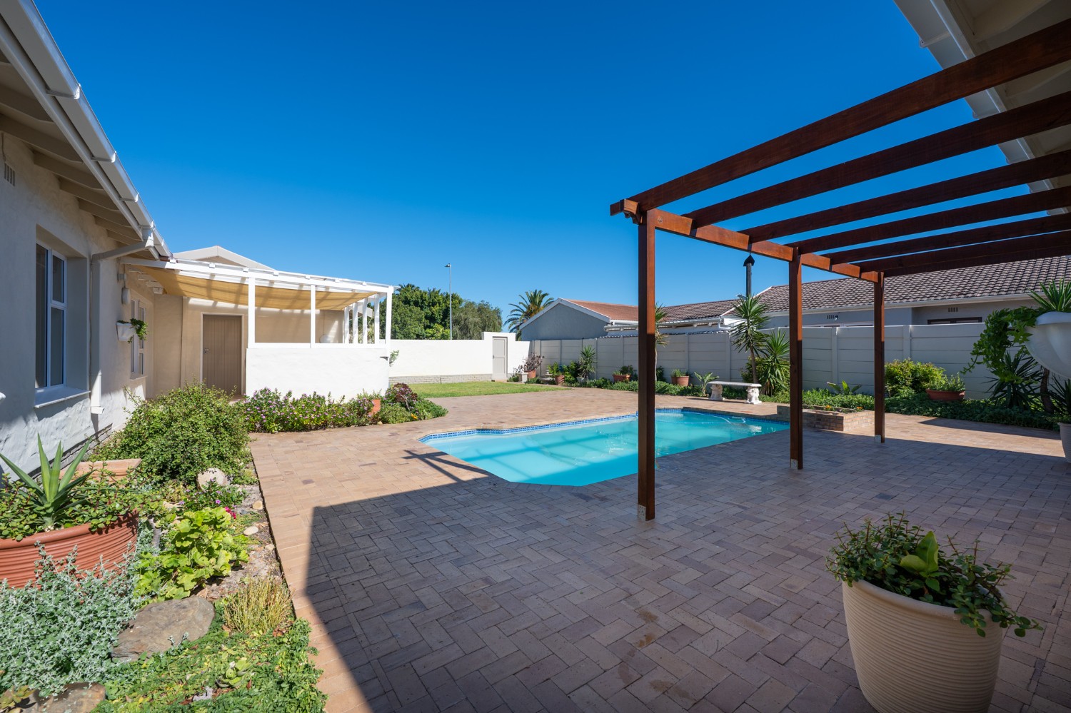 Step outside to enjoy a sparkling pool set within a large, low-maintenance garden, providing the perfect space for relaxation and outdoor entertaining.